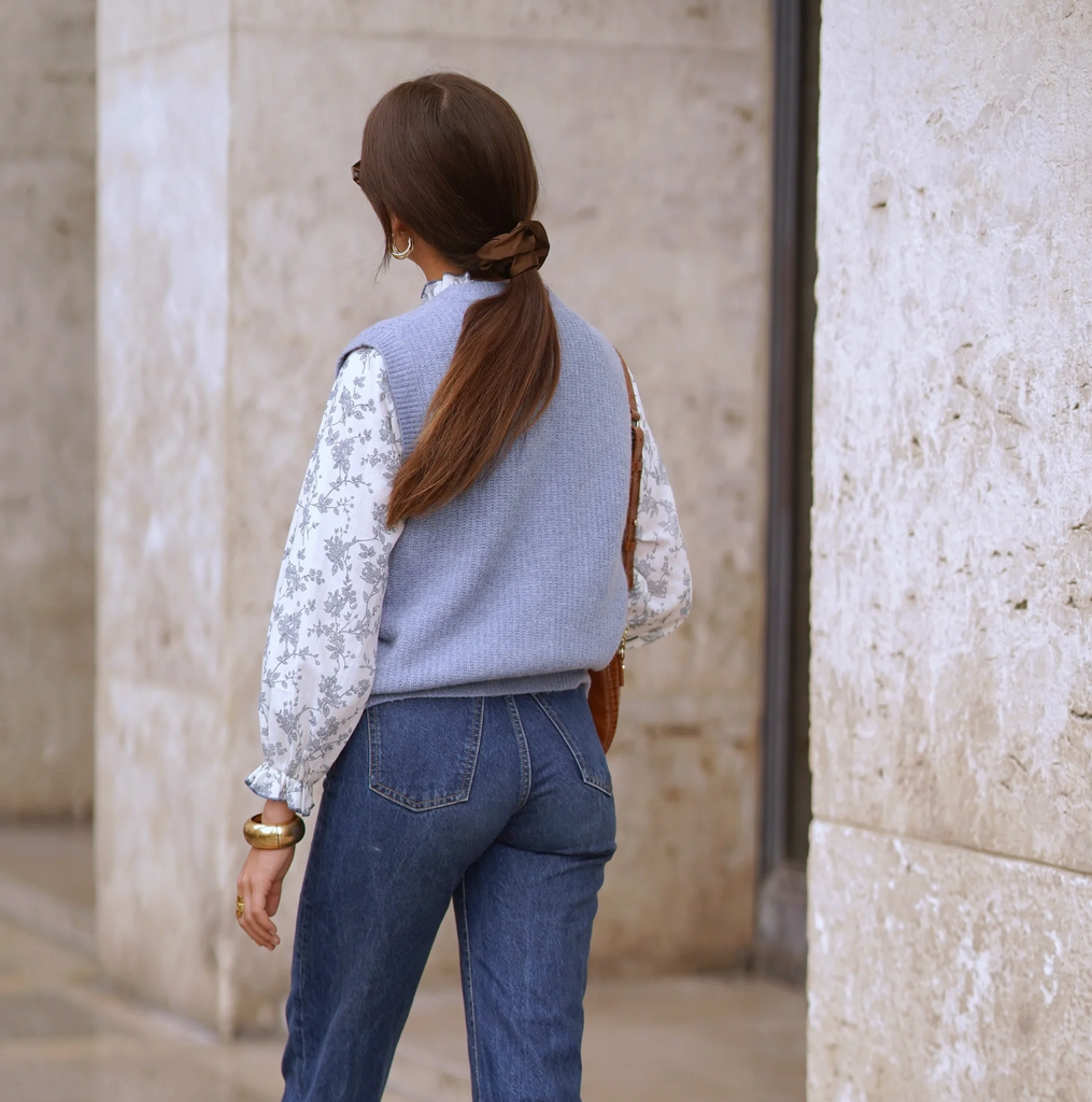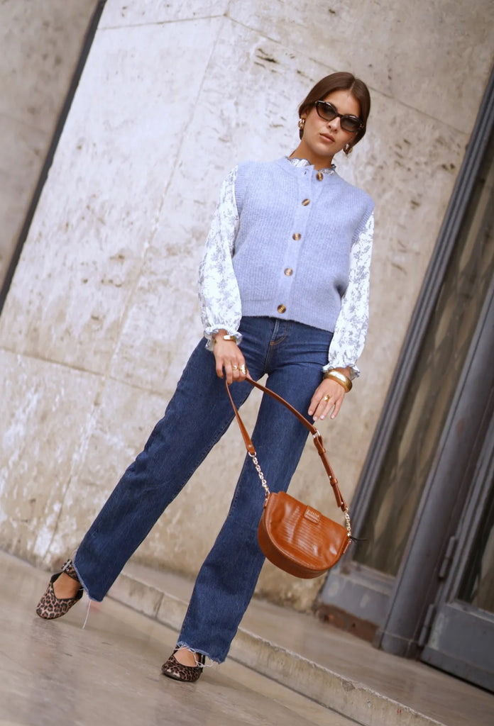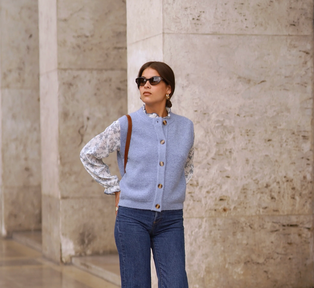 Die Maève Strickweste ist ein Must-have für die Übergangszeit und lässt sich problemlos im Lagenlook tragen. Aus weichem, leicht flauschigem Strick gefertigt, besticht er durch seinen beruhigenden Graublauton und den ärmellosen Vintage-Stil. Die kontrastierenden Knöpfe in Hornoptik verleihen ihm einen authentischen Touch, während der gerade, verkürzte Schnitt die Silhouette formschön strukturiert. Ob offen über einem Kleid oder zugeknöpft über einer Bluse mit Rüschenkragen wie dieser getragen, verleiht der Maève Cardigan jedem Outfit sofort Wärme und Stil. Er ist das perfekte Kleidungsstück für einen Bohème-, Chic- oder romantischen Look, je nach Stimmung. Produktdetails: Ärmelloser Cardigan aus Strukturstrick Vordere Knopfleiste mit Knöpfen in Hornoptik