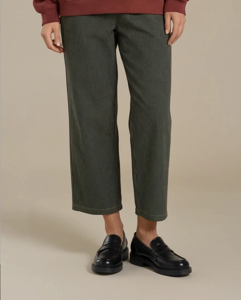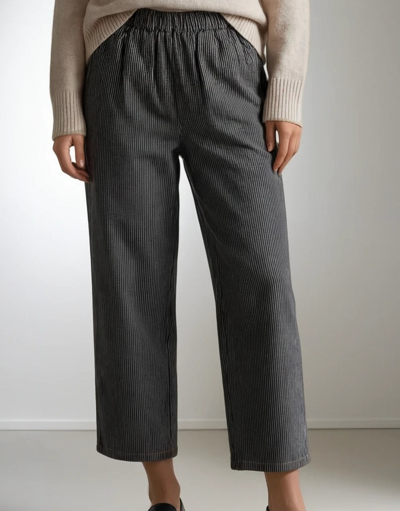 Der elastische Bund bietet einen angenehmen Sitz und maximale Bewegungsfreiheit, während die feine, vertikale Struktur dem grauen Stoff eine edle Tiefe verleiht. Das weiche, formstabile Material fällt locker und schmeichelt der Figur.