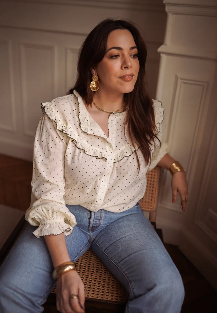 Diese feminine Bluse aus 100 % Baumwolle vereint zeitlose Eleganz mit einem Hauch Vintage-Charme. Das zarte Cremeweiß mit feinem schwarzem Pünktchenmuster sorgt für eine edle, aber dennoch verspielte Optik – perfekt für stilvolle Alltagslooks oder besondere Anlässe.