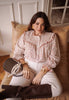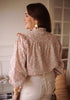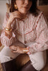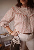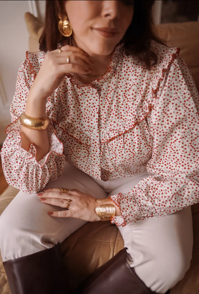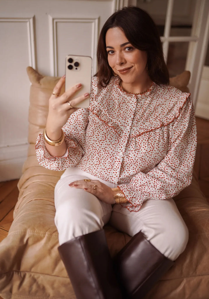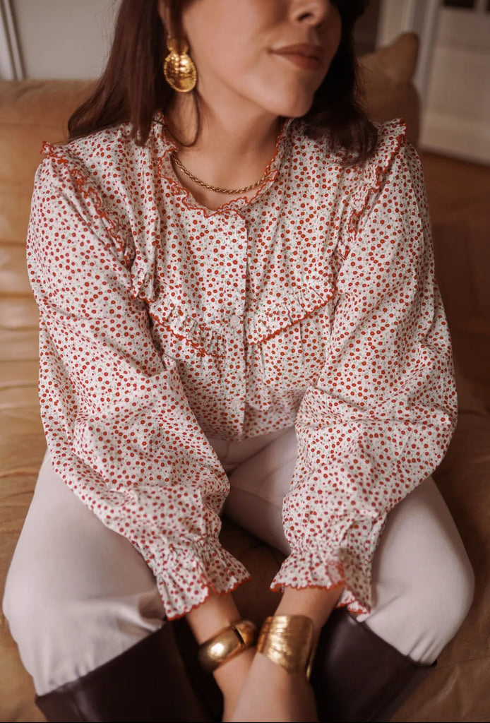 Romantische Bluse mit kleinem Floralem Print in Rot und Grün mit Volant.