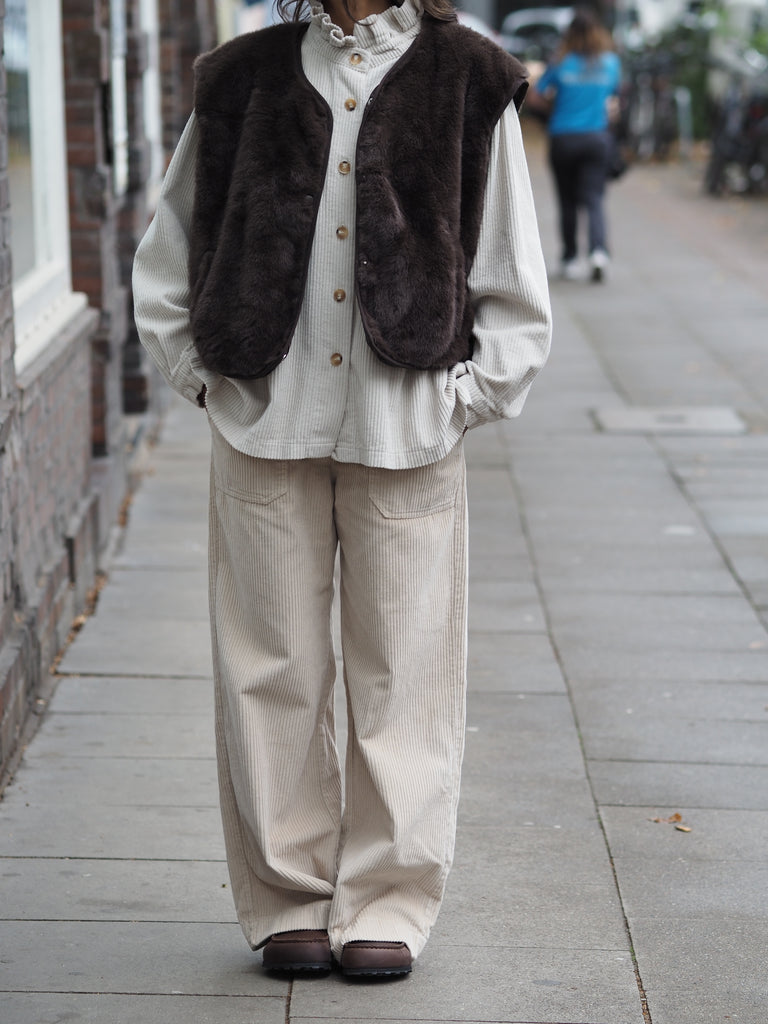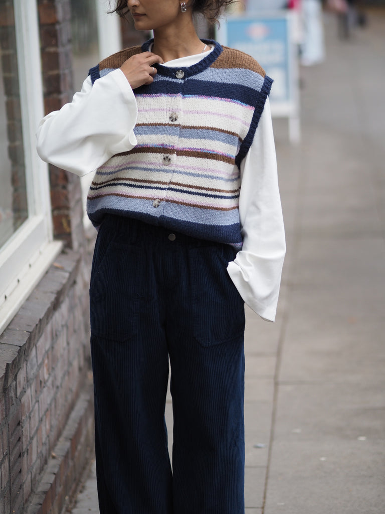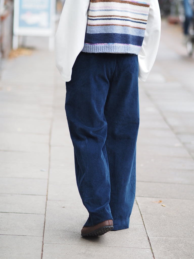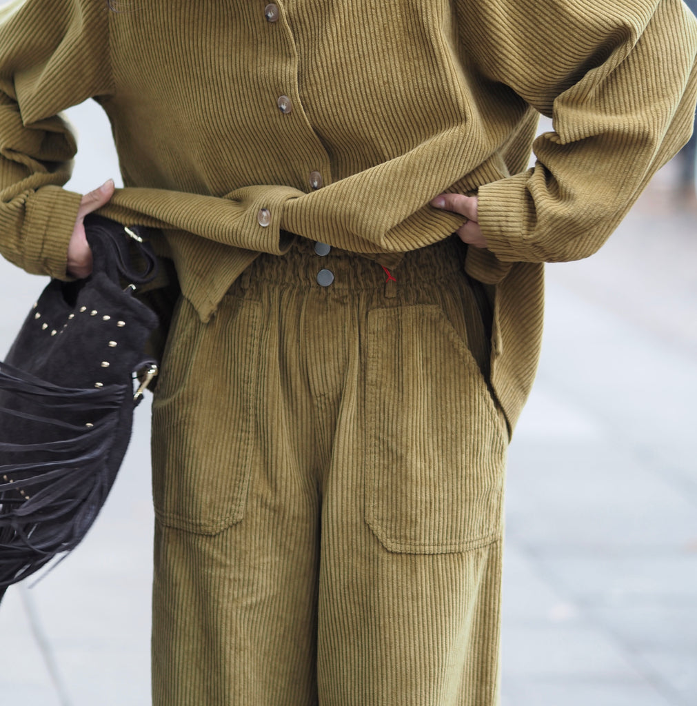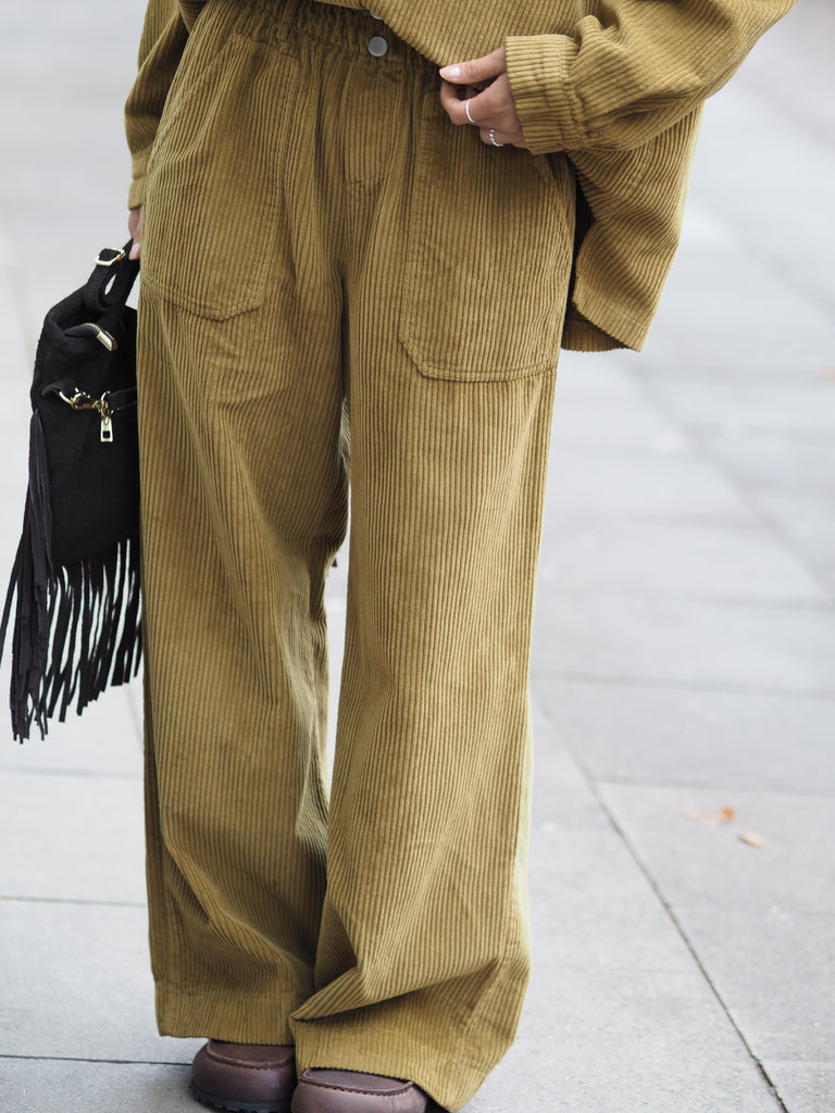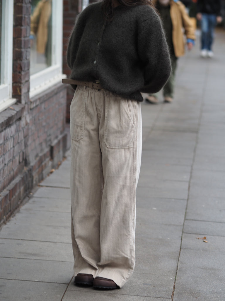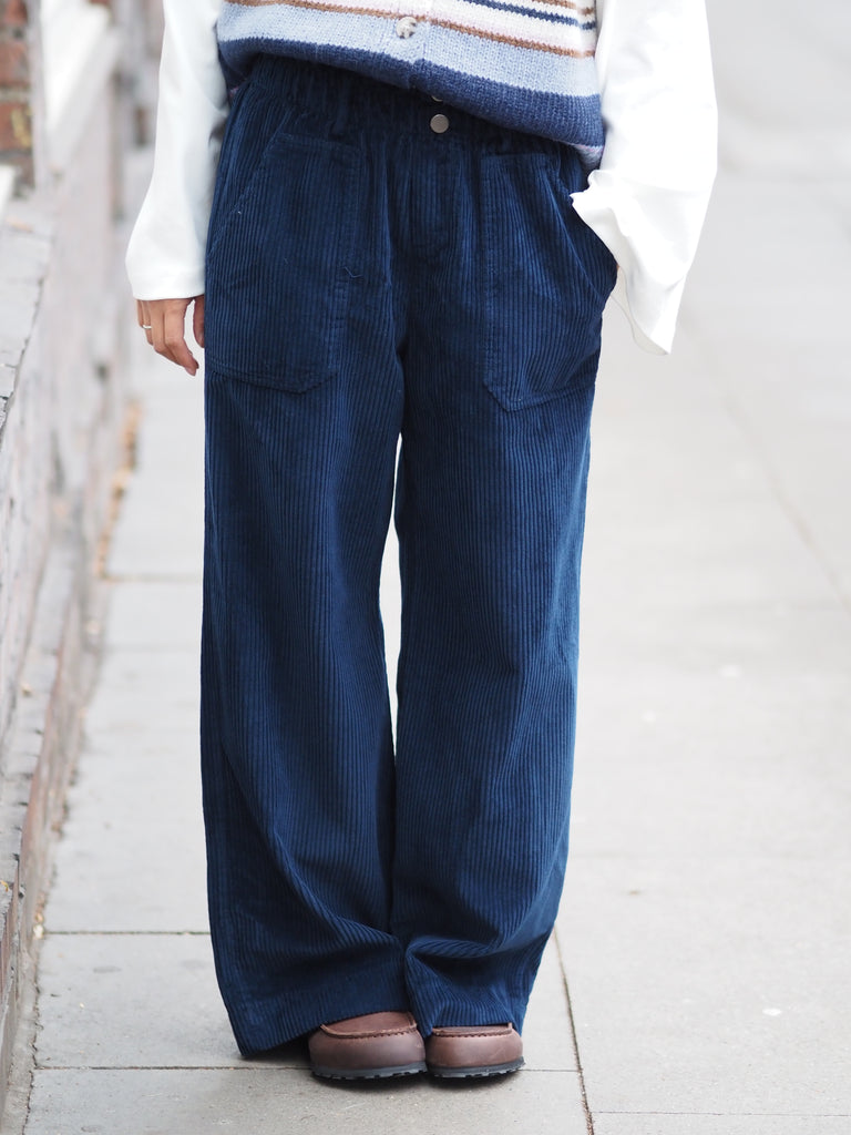 Die weiche Breitcordhose mit Gummizug und zwei aufgesetzten Knöpfen in Paperback Stil.