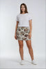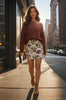 Der Rock ist ein kurzer, leicht A-linienförmiger Minirock aus einem dickeren, strukturierten Stoff, der an Gobelin- oder Jacquardwebung erinnert. Das Muster besteht aus großen, vintage-artigen Blumenmotiven in warmen und leicht gedämpften Farben: