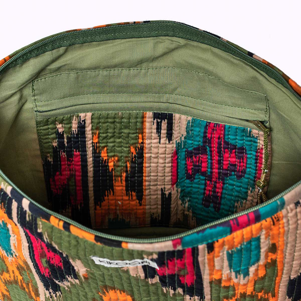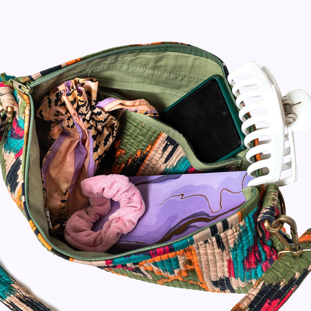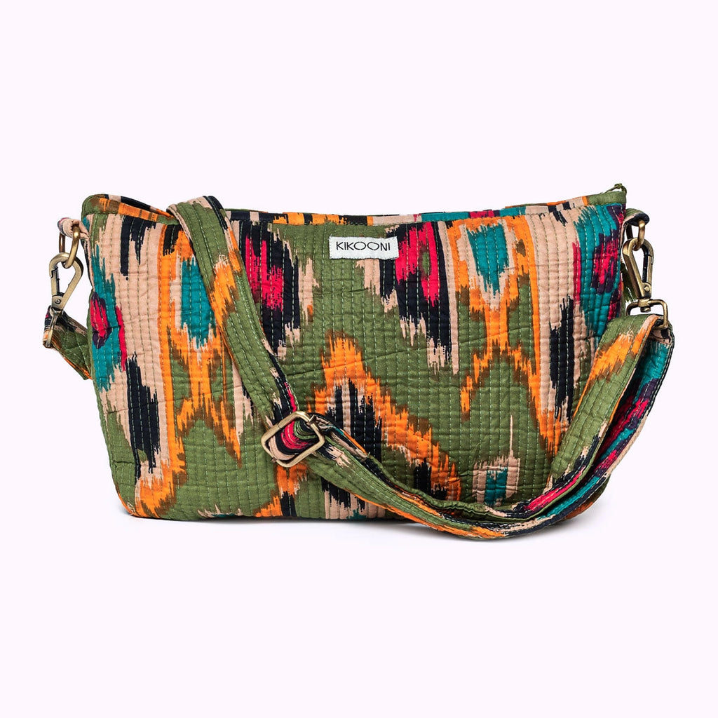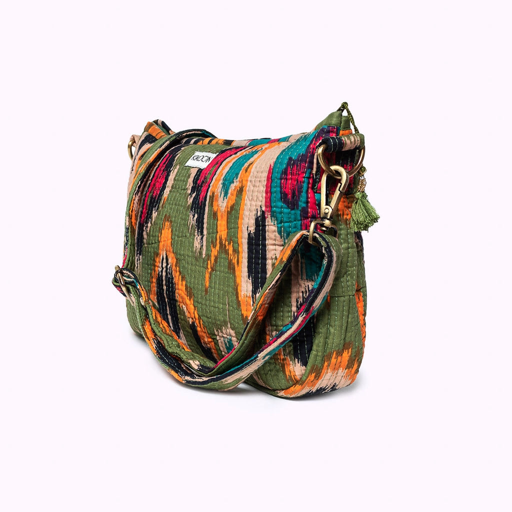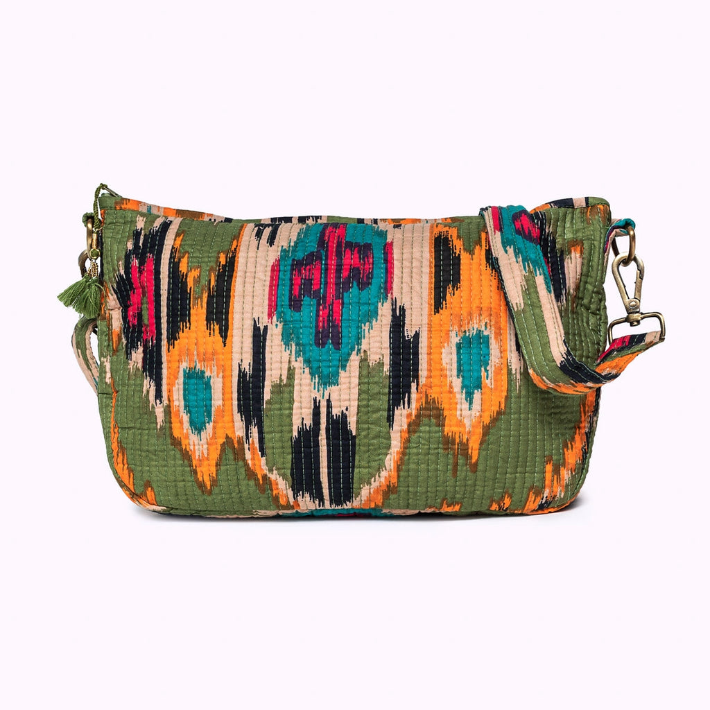 K Bag - die Tasche die alles kann und dabei gut aussieht! Die K BAG "Green Ikat" ist mehr als nur eine Tasche. Sie ist dein neuer Everyday Begleiter mit Stil und Stärke. Ob für den Alltag oder das nächste Abenteuer, diese Tasche ist immer dein perfekter Belgeiter. Unsere vielseitigen Crossbody- und Slingbags aus Baumwolle vereinen farbenfrohes Design mit praktischer Funktionalität. Jede Tasche verfügt über eine separate Innentasche für mehr Übersicht und sicheren Stauraum. Dank des abnehmbaren und längenverstellbaren Gurts lässt sich die Tasche flexibel tragen – als lässige Crossbodytasche, kompakte Handtasche oder eng anliegende Slingbag. Perfekt für Alltag, Reisen oder Festivals! Und es ist wirklich erstaunlich was alles in diese Tasche passt! Das Beste: Unsere K Bags sind pflegeleicht und waschbar – so bleiben sie lange schön und frisch, selbst bei häufigem Gebrauch. Details: • Material: 100 % Baumwolle • Innen: Separate Innentasche • Tragemöglichkeiten: Crossbody, Handtasche oder Slingbag • Gurt: Abnehmbar und längenverstellbar • Pflegeleicht und waschbar • Größe: ca. 36 x 22 x 10 cm ( B x H x T) cm Mit ihrem einzigartigen Muster sind diese Taschen echte Hingucker und zuverlässige Begleiter für jede Gelegenheit! Liebevolle Handarbeit Die handgemachte Schultertasche ist eine wunderbare Ergänzung zu unseren farbenfrohen Shoppern und im Alltag nicht mehr wegzudenken. Egal ob für die schnelle Fahrt mit dem Fahrrad zum Einkaufen, an den See oder in die Bar . Sie ist perfekt geeignet um Handy, Lippenstift und Handcreme unterzubringen , aber auch dein Geld oder Ausweise finden hier locker Platz! . Sogar eine 1 - Literflasche passt hier rein. Ein Raumwunder! Alle wichtigen kleinen Dinge des Lebens kannst du hier organisiert und griffbereit verwahren .