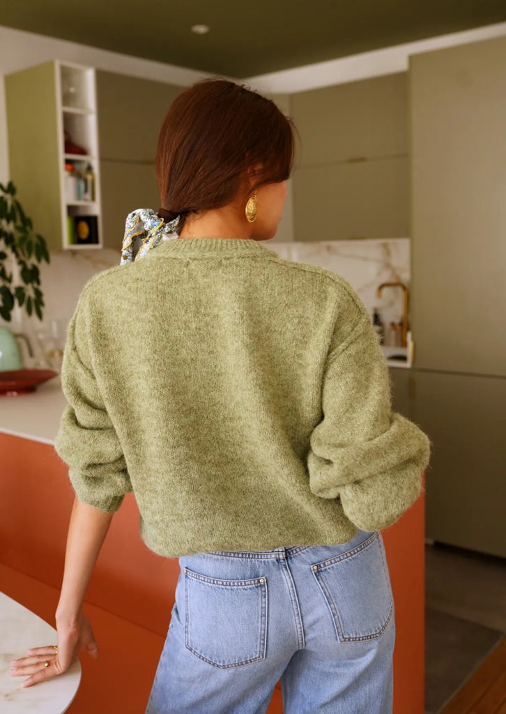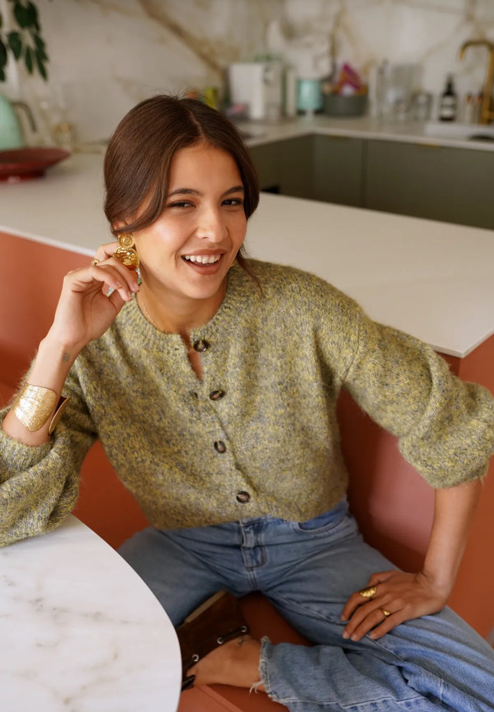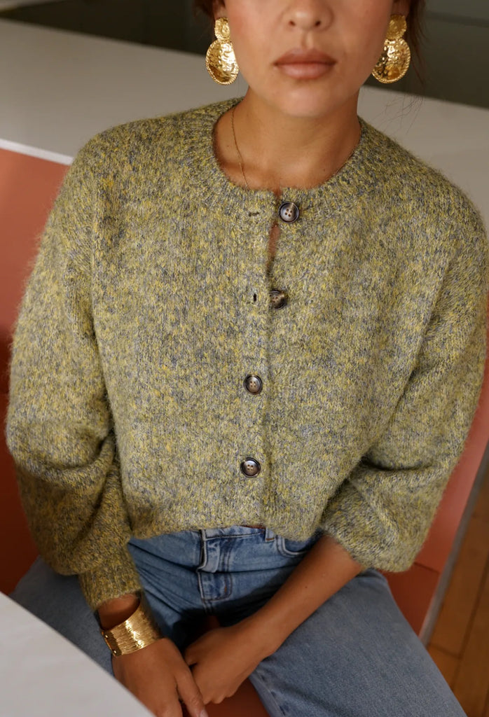 In schönen Senf -Grüntönen ist dieser Basic Cardigan für alle sie Erdtöne lieben ein Must have. Weicher Griff, klassischer Schnitt.