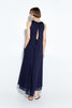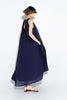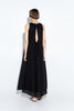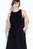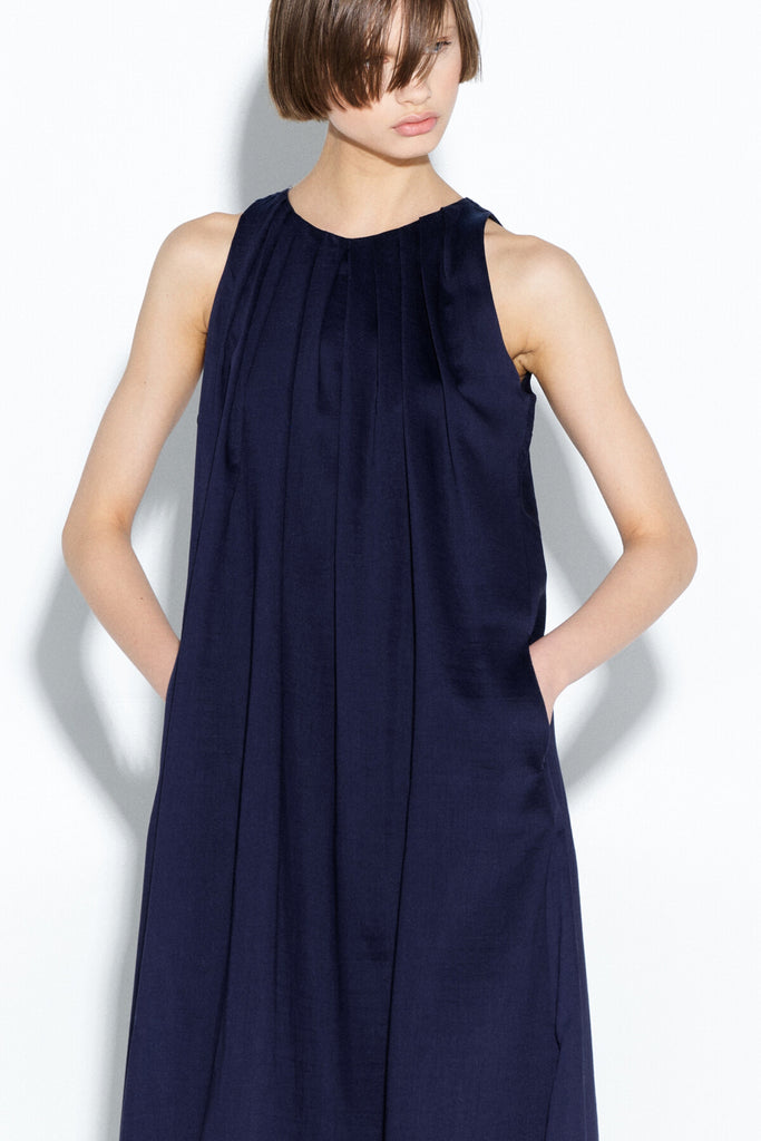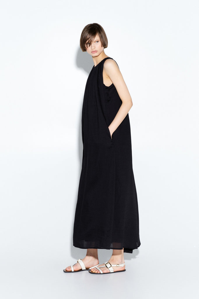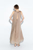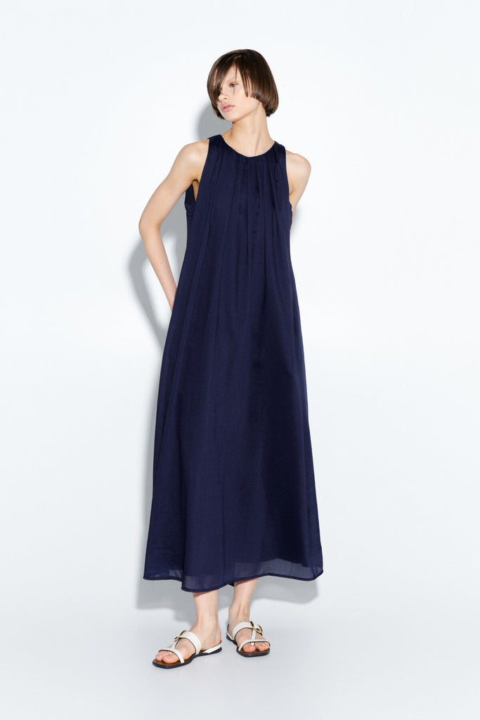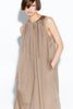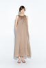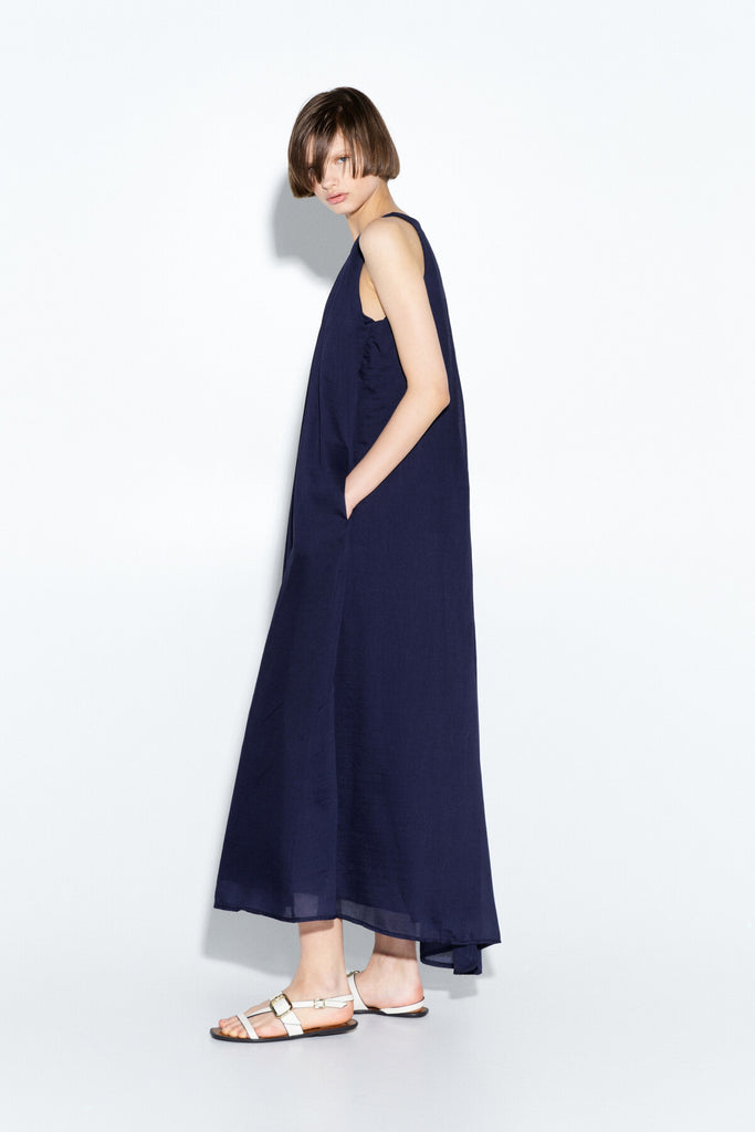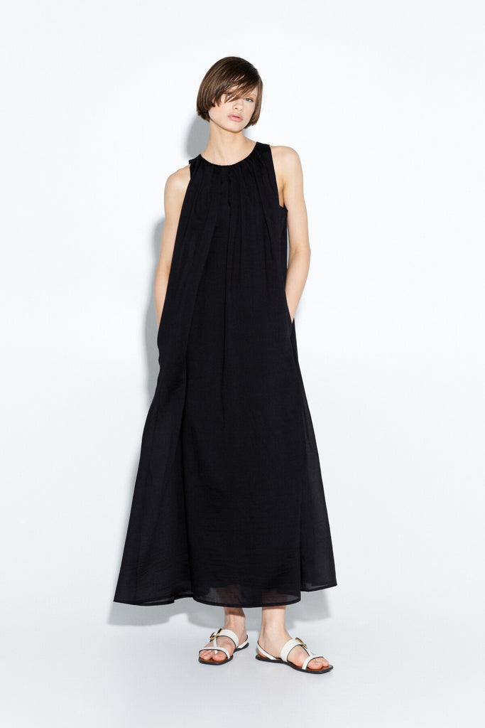 Langes fliessendes Kleid mit rundem Ausschnitt und Falten.