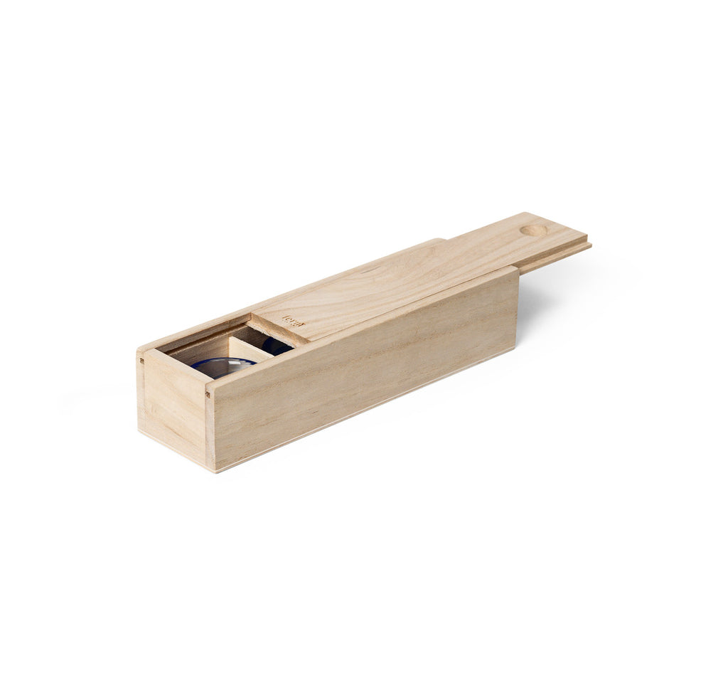 Material: Maschinengepresstes Glas mit Muster in Volltonfarbe. Verpackt in einer Holzbox