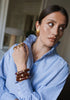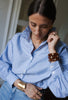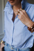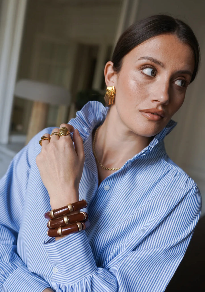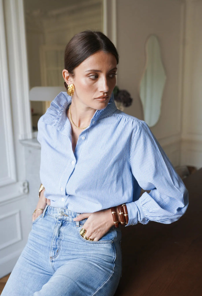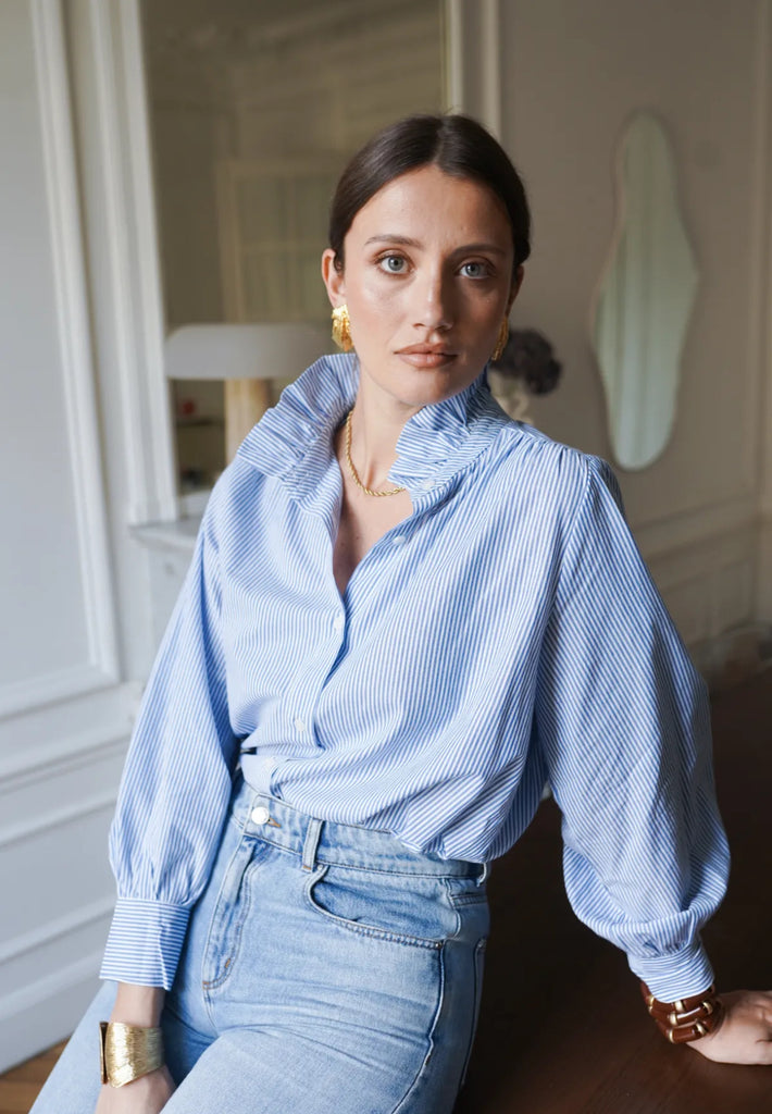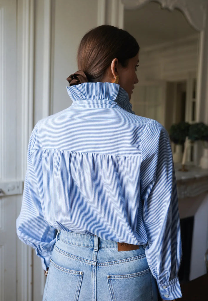 Klassische Streifenbluse mit hohem Rüschenkragen und geradem Schnitt.