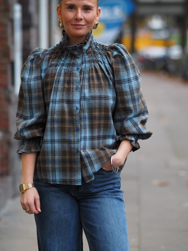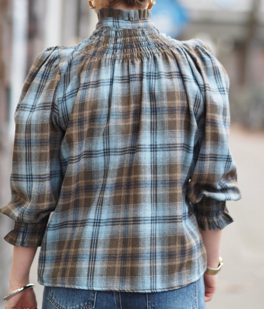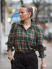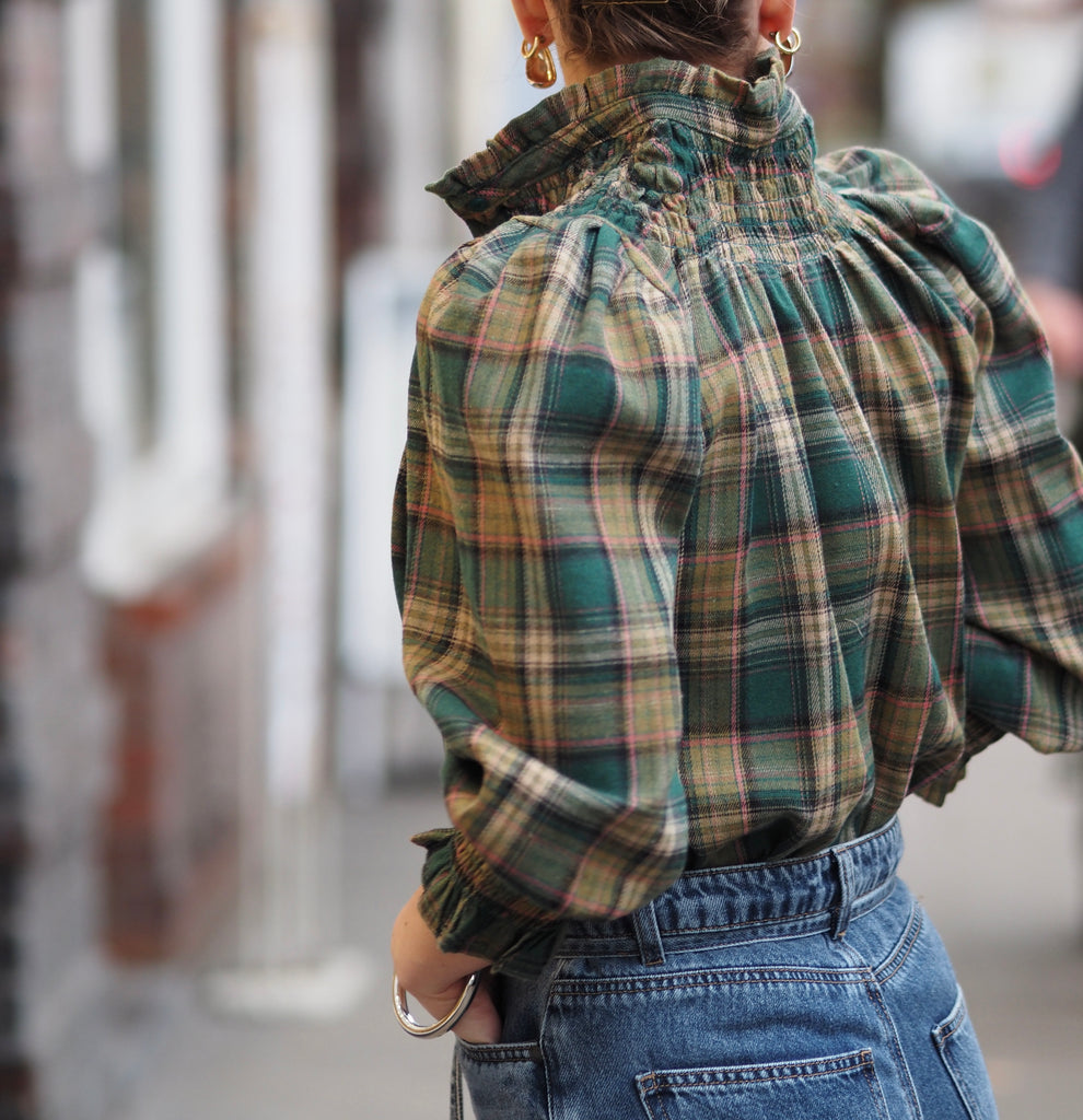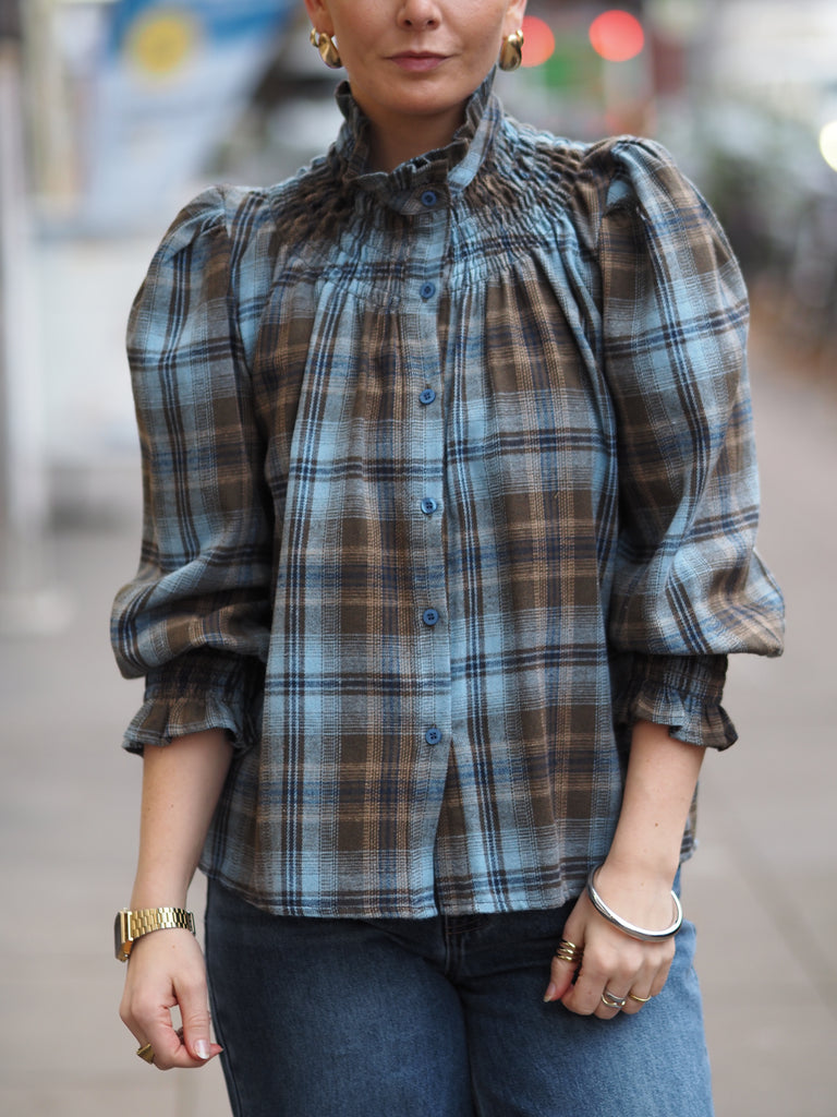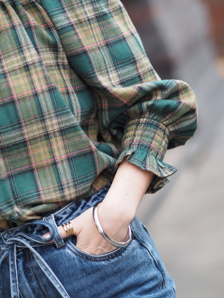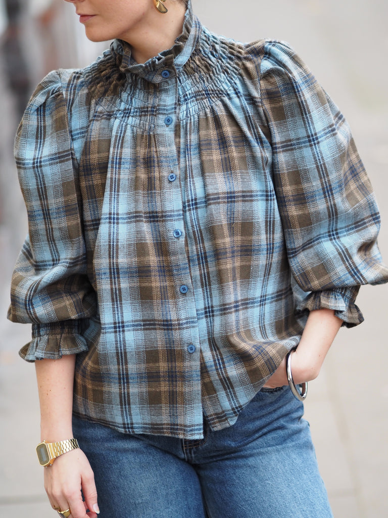 Stil: Die Kombination aus Puffärmeln, Raffung und Karo gibt der Bluse einen romantischen, leicht nostalgischen Country- bzw. Cottagecore-Look, gleichzeitig aber auch etwas Modernes.