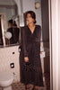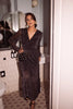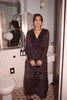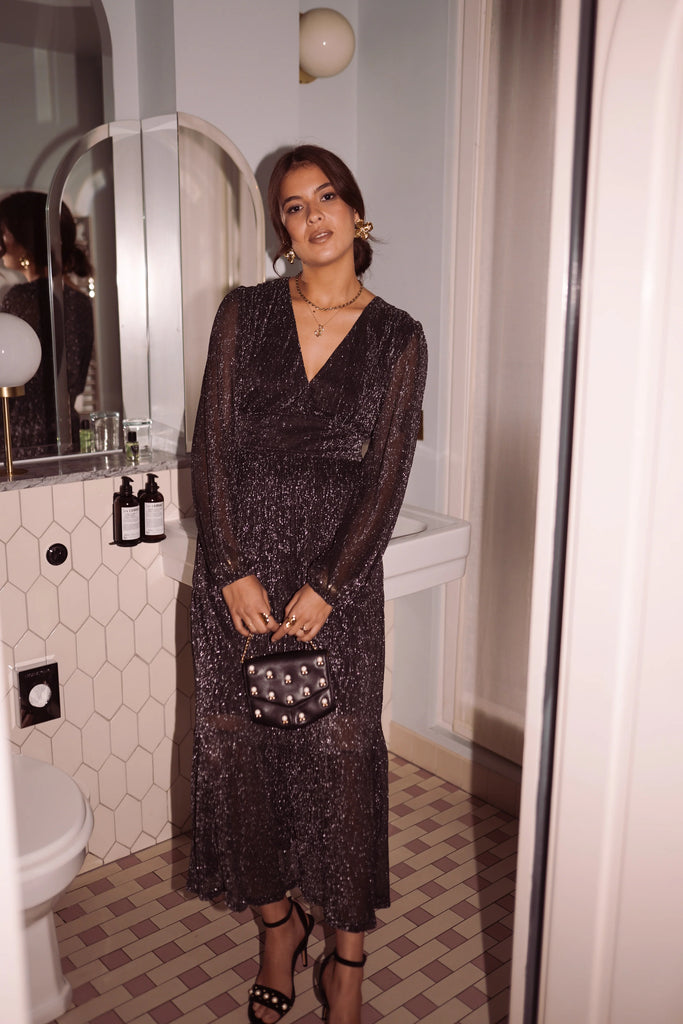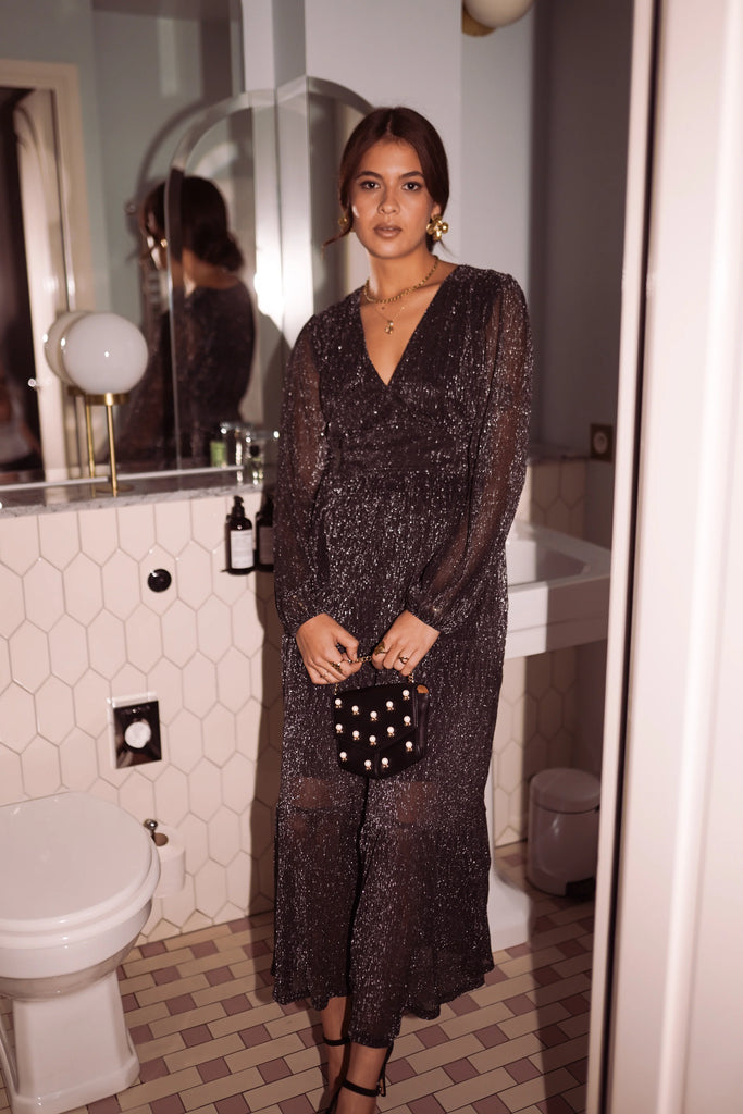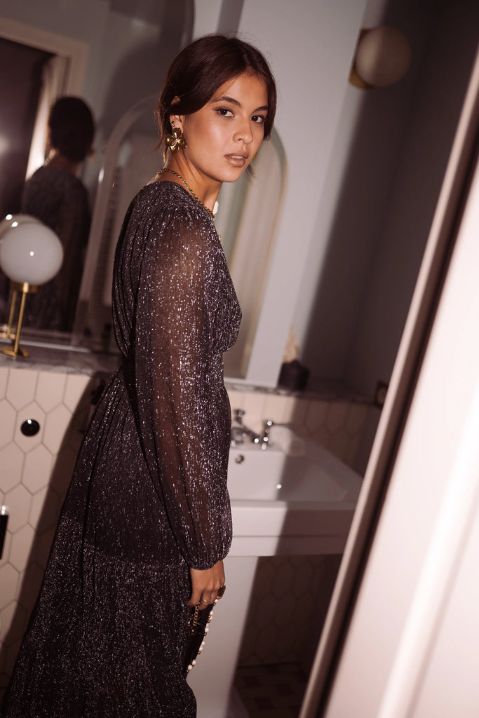 Das Kleid Ayla verleiht Ihrer Garderobe einen festlichen Touch. Der leichte Stoff, durchzogen von schimmernden Fäden, sorgt für ein dezentes Funkeln, während die lange, fließende Silhouette die Figur optisch streckt. Der V-Ausschnitt betont die Brust, die transparenten Ärmel verleihen dem Kleid eine zarte Note und die betonte Taille sorgt für eine mühelos feminine Silhouette. Ein perfektes Kleid für die Feiertage. Produktdetails: • Langes, fließendes Kleid • Leichter Lurexstoff • V-Ausschnitt • Lange, leicht transparente Ärmel • Betonte Taille für eine strukturierte Silhouette