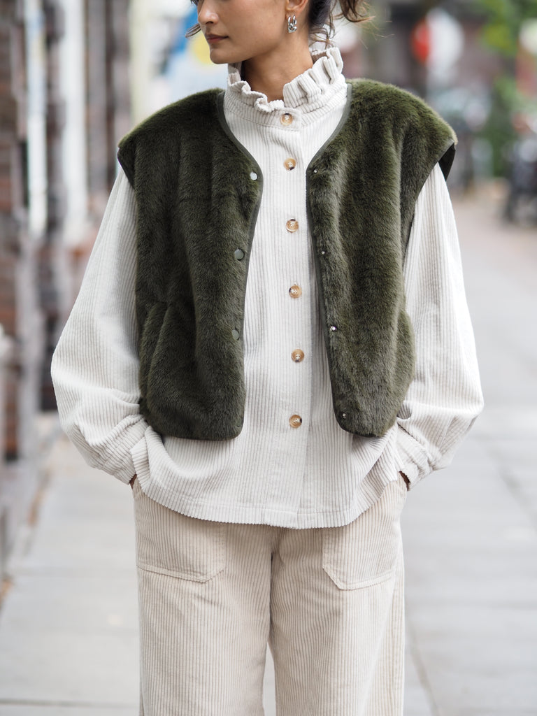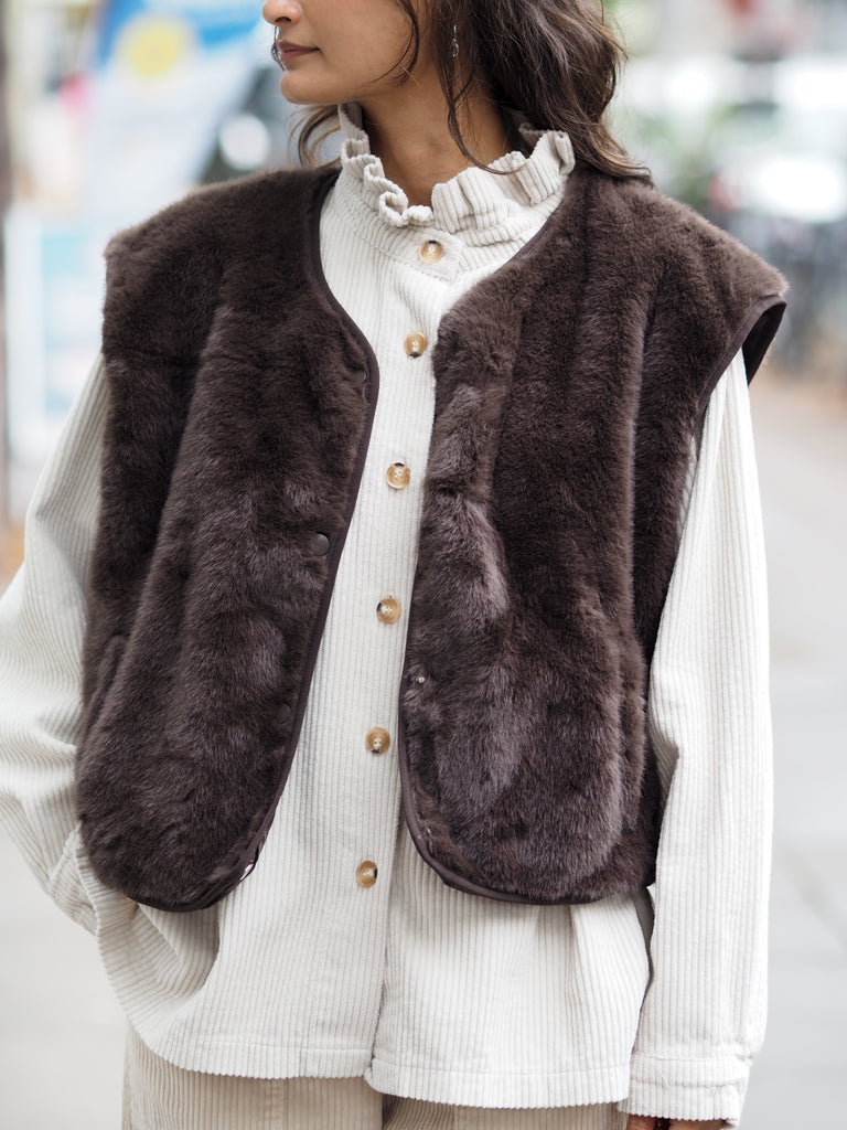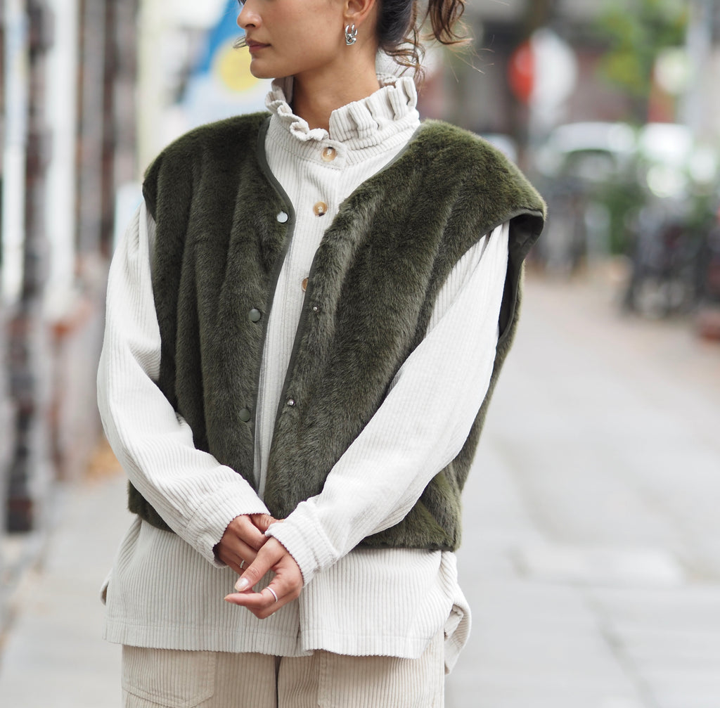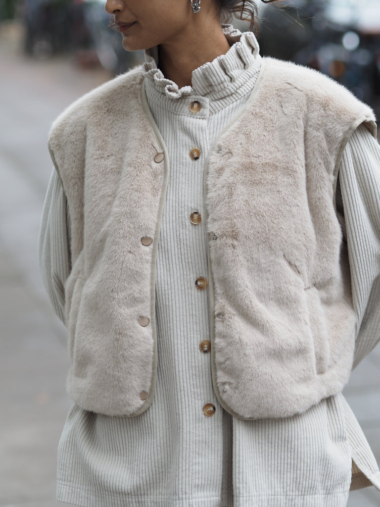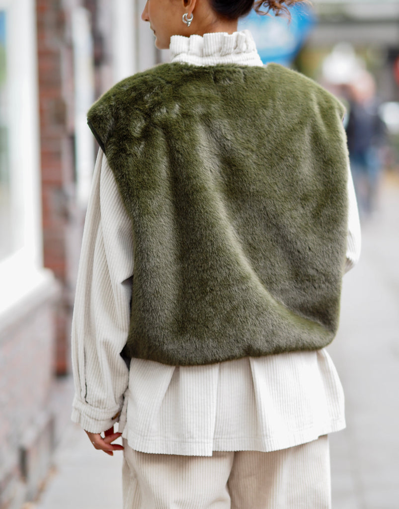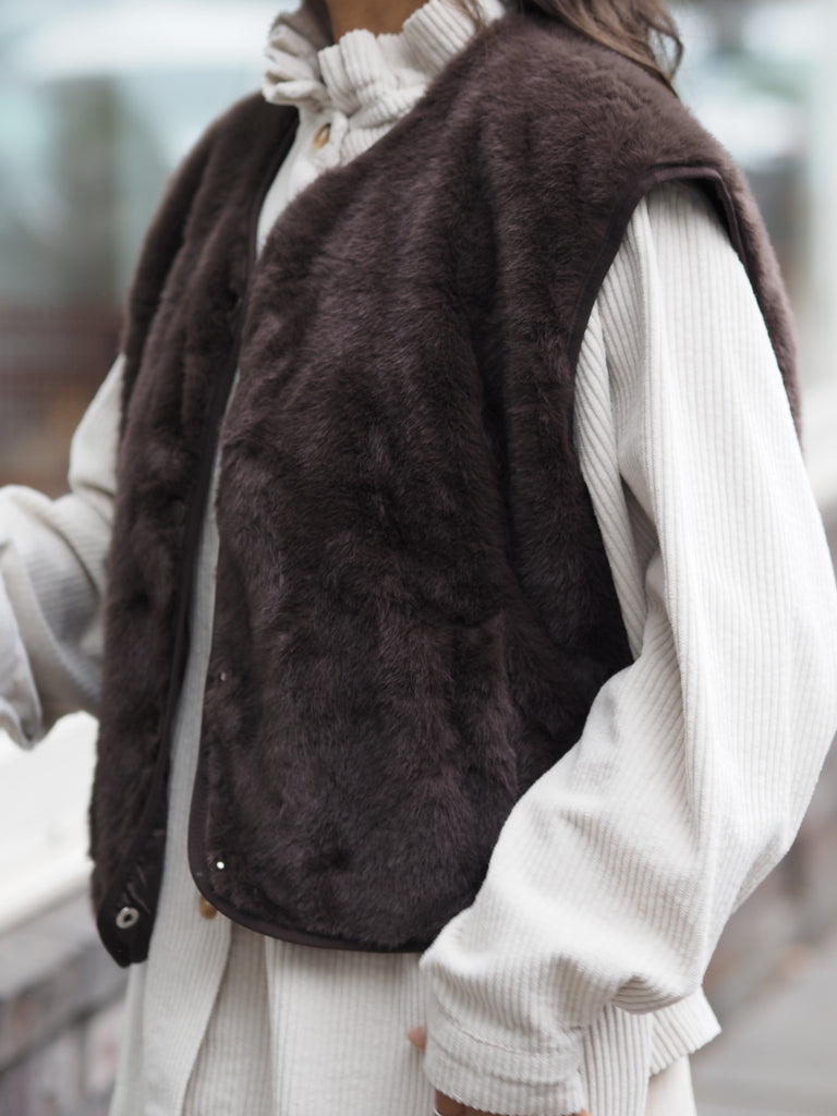 Fake Für Weste ( Fake Für: Kunstpelz)  mit Druckknöpfen und Taschen mit kurzem kastigem Schnitt.