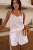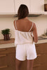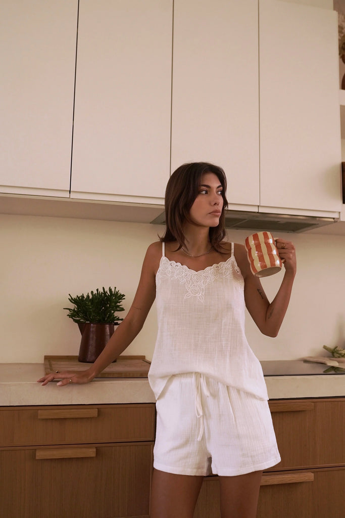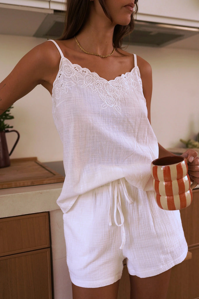 Dieses leichte Baumwoll-Tanktop besticht durch die zarte Blumenstickerei am Ausschnitt, die ihm eine feminine und raffinierte Note verleiht. Mit seinen dünnen Trägern und dem fließenden Schnitt bietet es optimalen Tragekomfort – perfekt für Sommertage oder ein lässiges Outfit zu Hause.