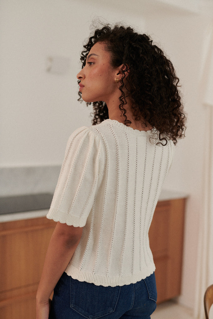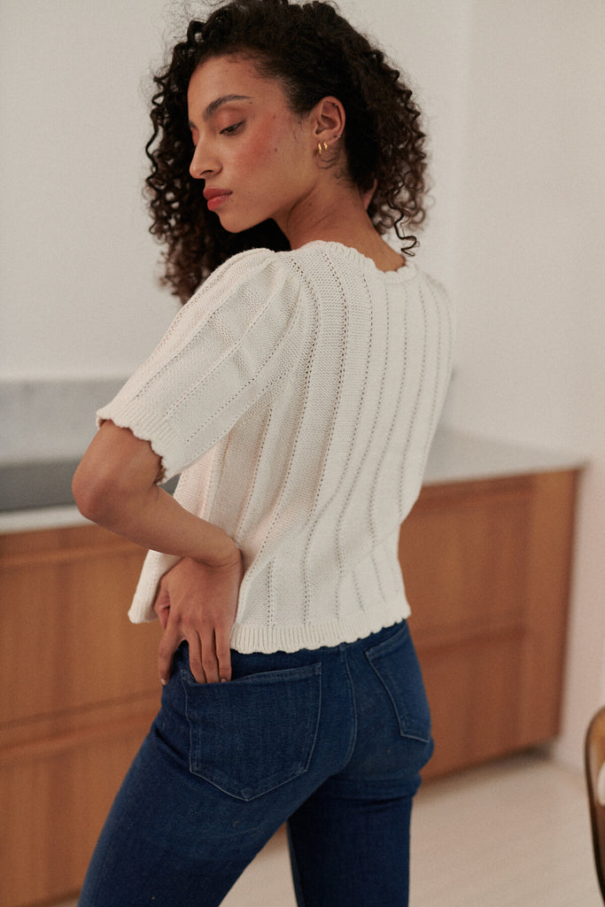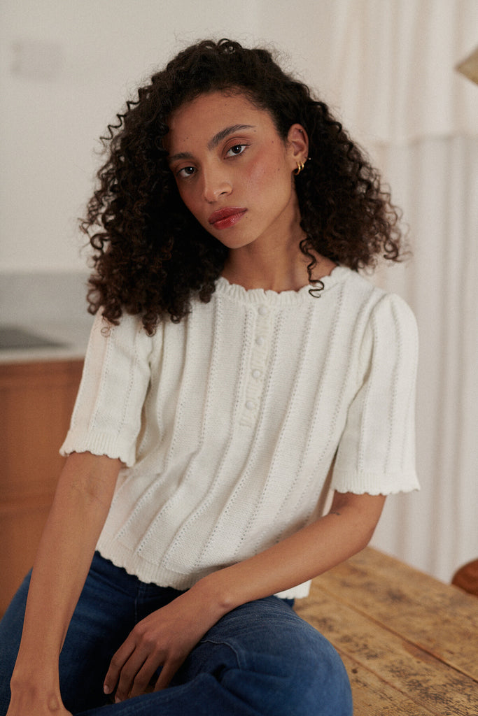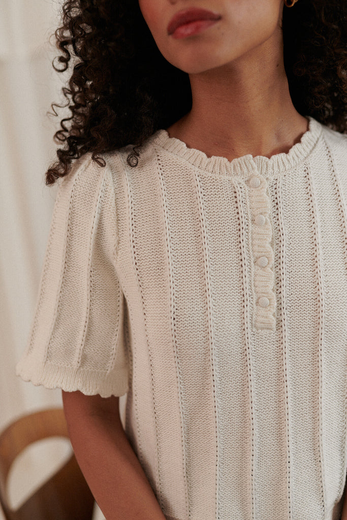 Baumwollstrick mit kurzen ÄrmelnRunder Ausschnitt durch ein Beinbein geschlossen Knöpfe mit Netz bedeckt Stricken in Perlenabmessungen Länge von Schulter: 50 cm für eine Größe S ⁄ m