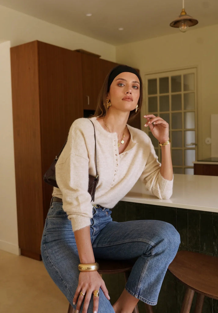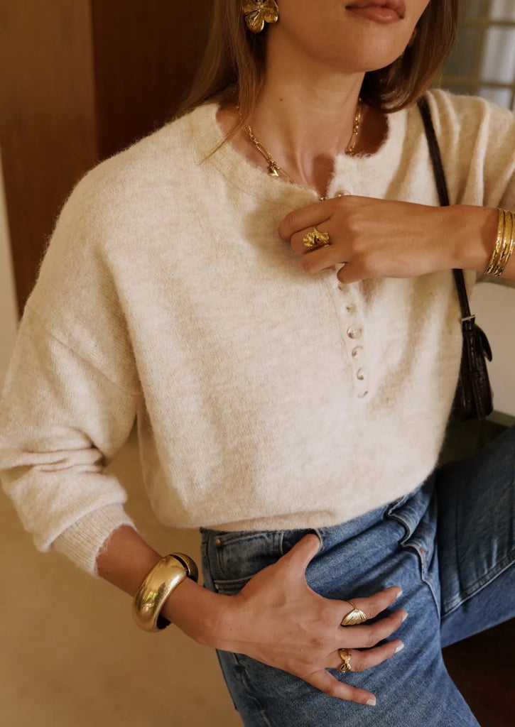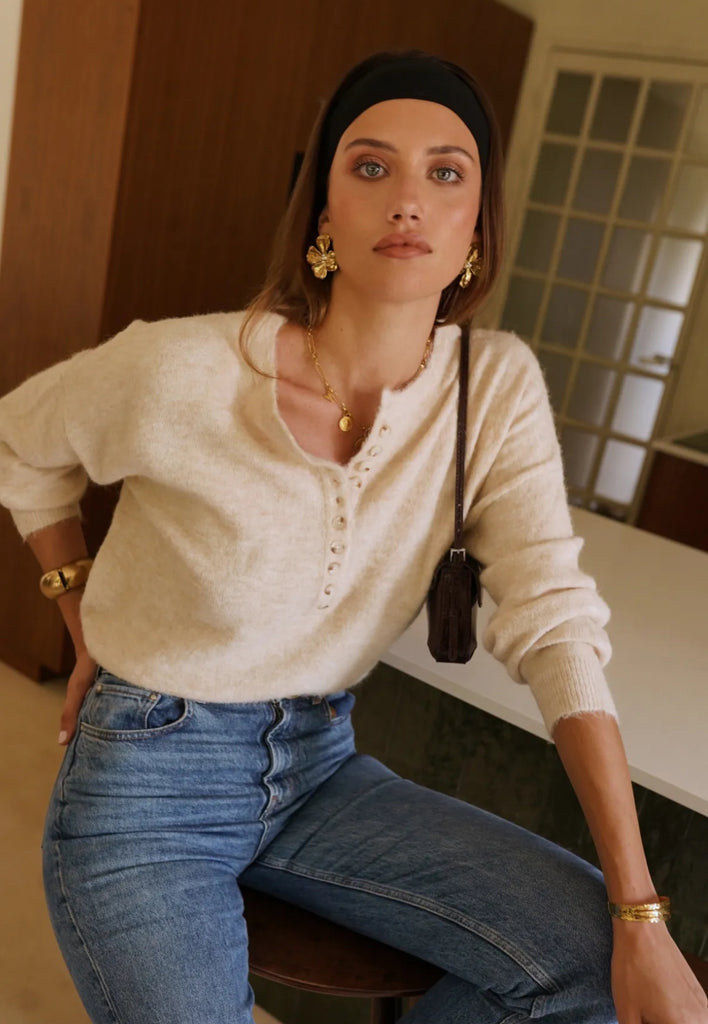zu sein, während der Button-Down-Ausschnitt im Henley-Stil die