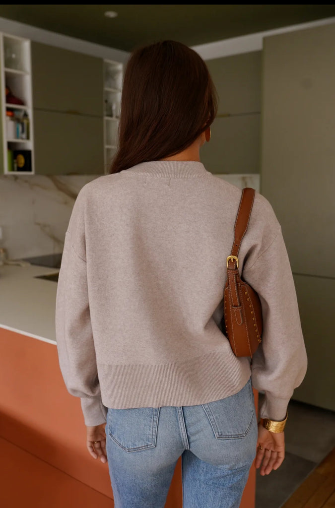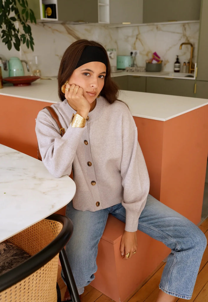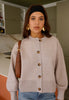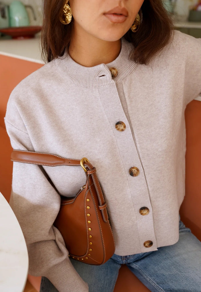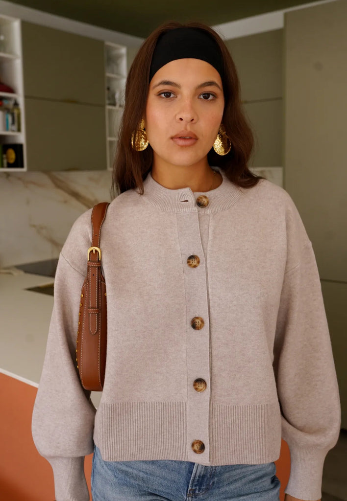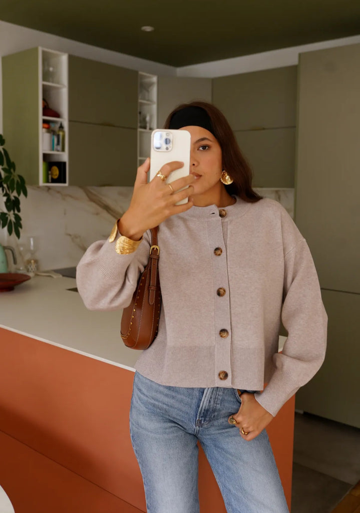 Weicher kurzer Cardigan in einem saften Beige. Weicher Griff, große Knöpfe, croped Schnitt und Rundhaltsausschnitt.