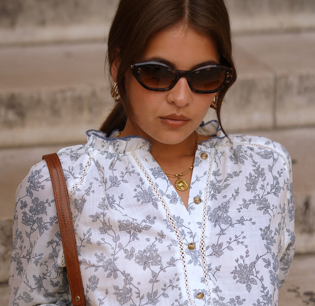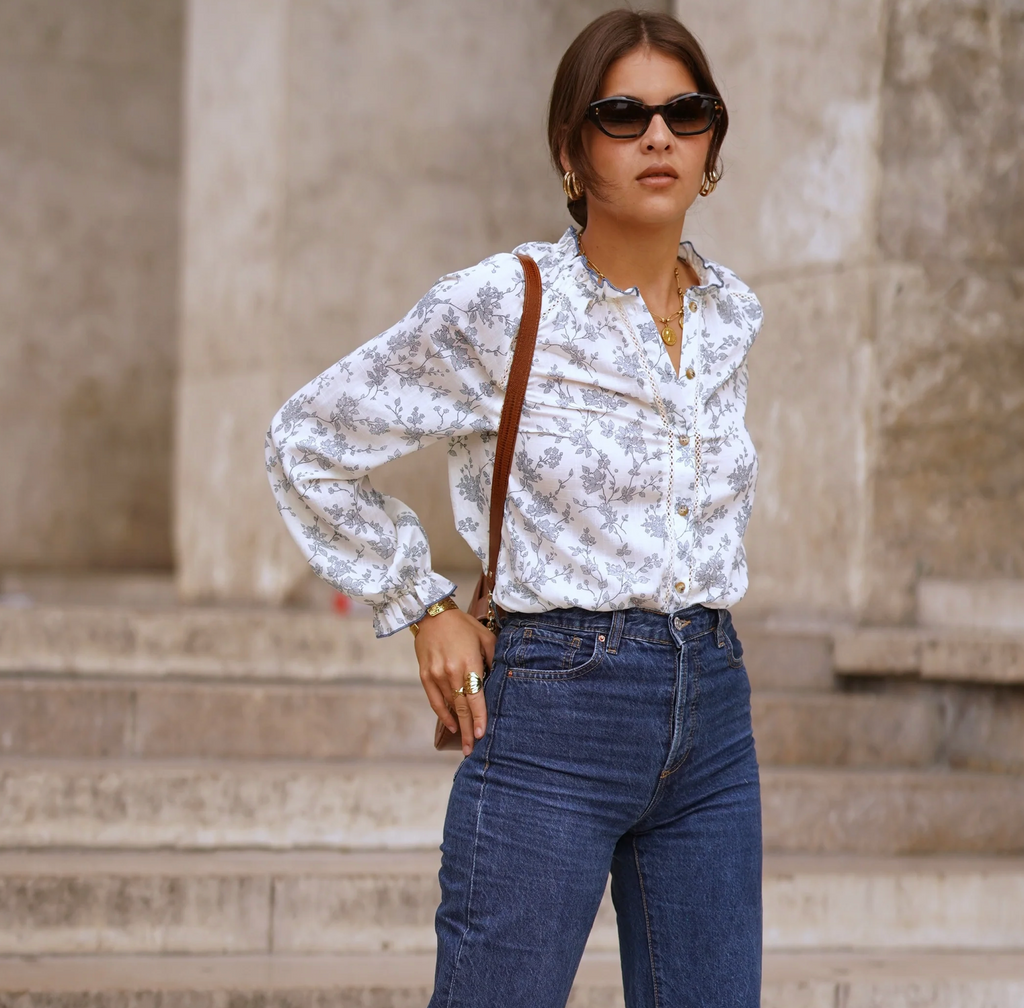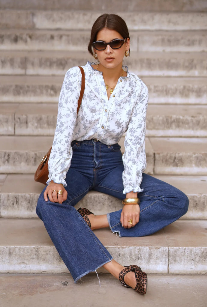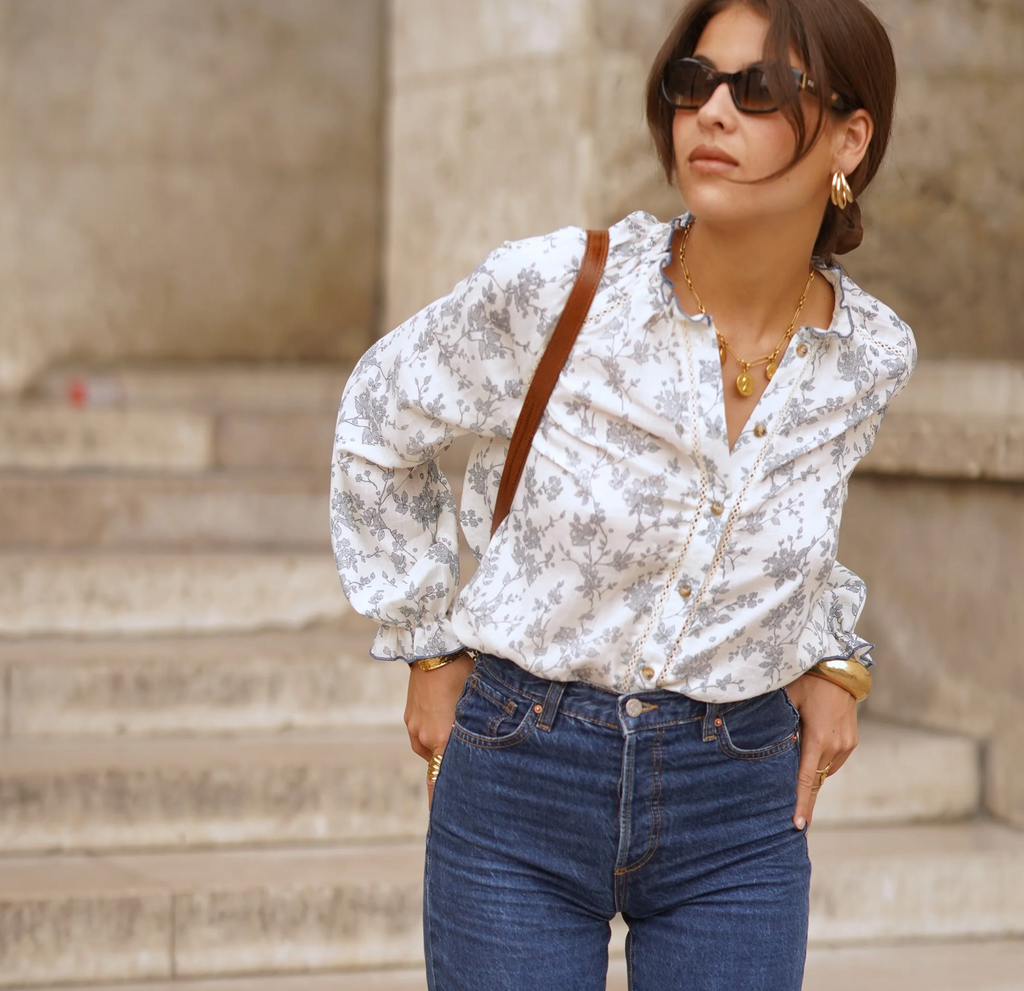 Verleihen Sie Ihrer Garderobe mit der Bluse Anouk einen Hauch romantischer Frische. Das Modell aus leichtem, fließendem Stoff besticht durch seinen zarten Blumendruck in sanften Grautönen auf ecrufarbenem Untergrund. Der leicht hohe Kragen und die dezente Knopfleiste verleihen ihm einen Hauch von Raffinesse, während die langen, leicht gepufften Ärmel mit gerafften Manschetten für schönes Volumen und eine feminine, moderne Silhouette sorgen.