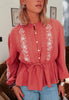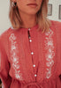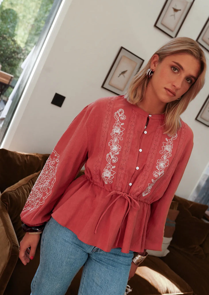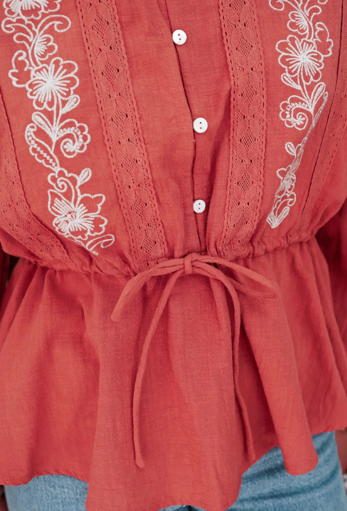 Frische Bluse in Koralle mit weißer Stickerei und Zugband in der Taille.