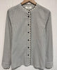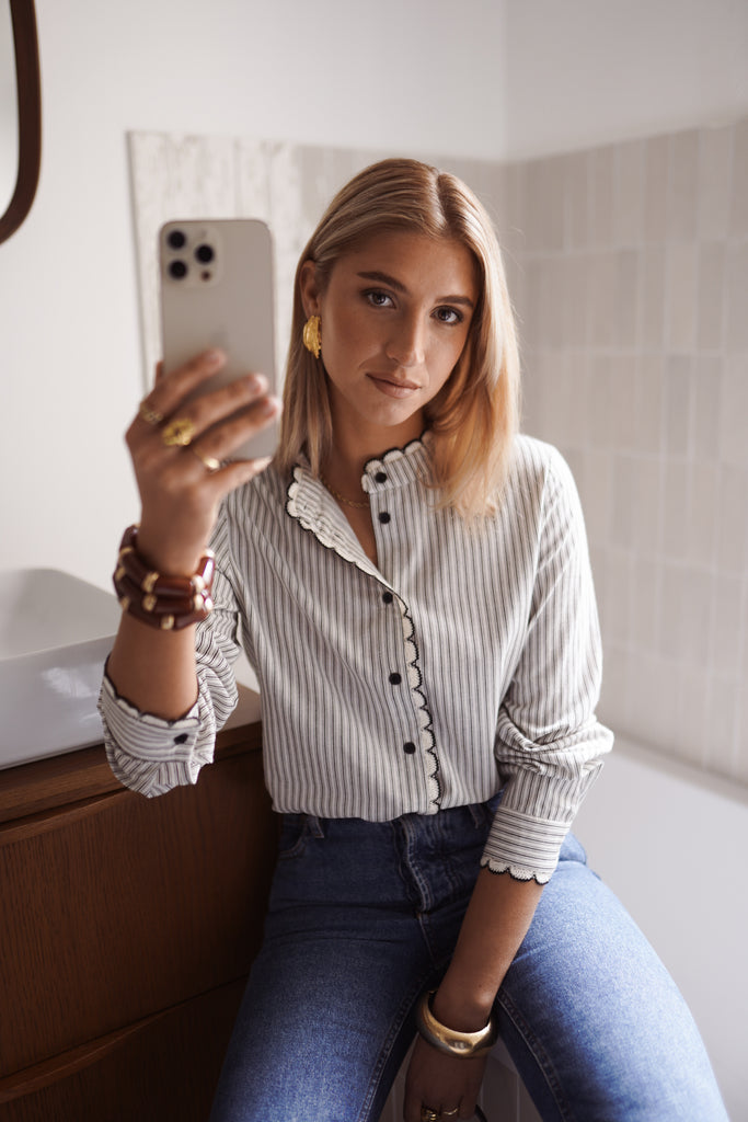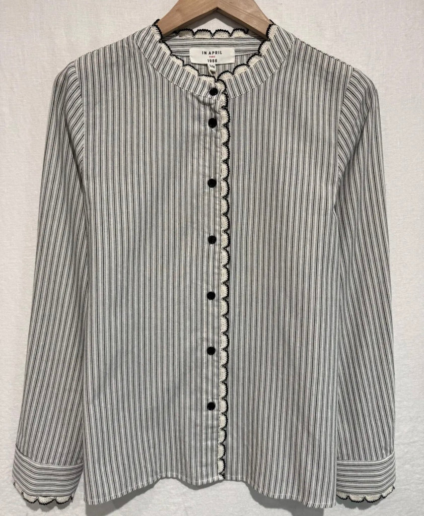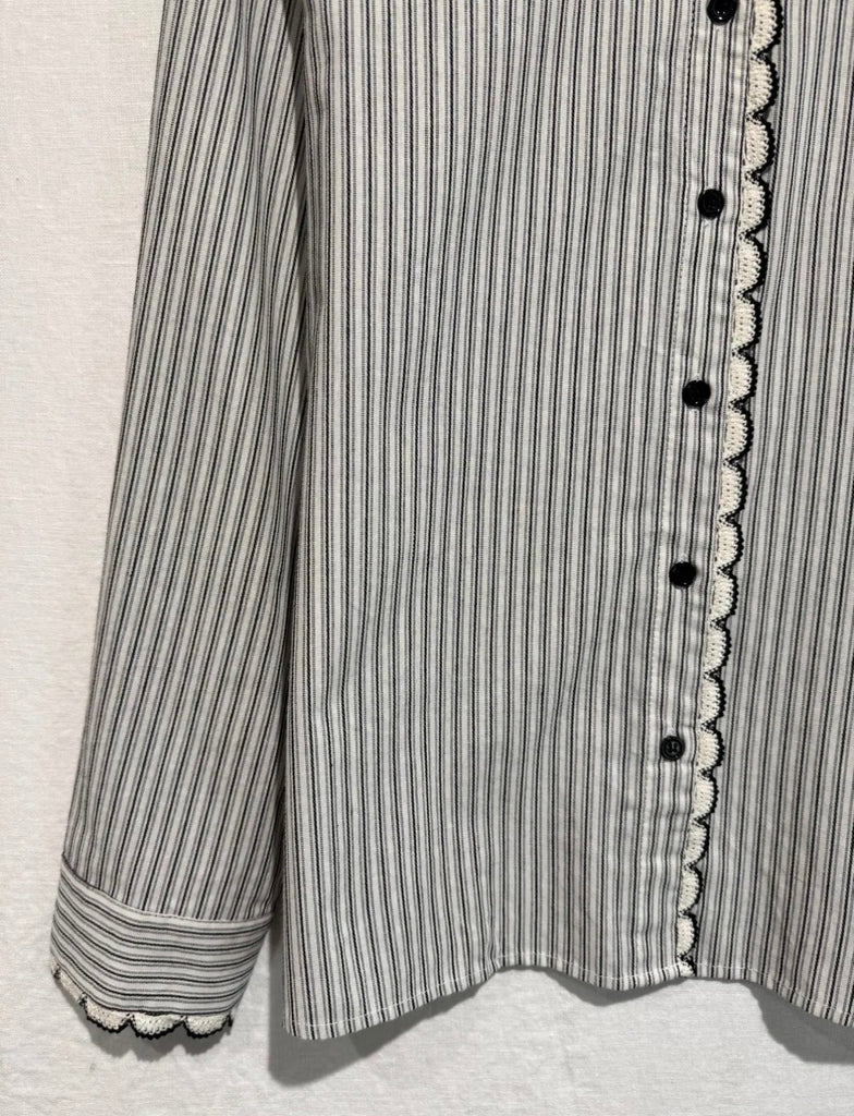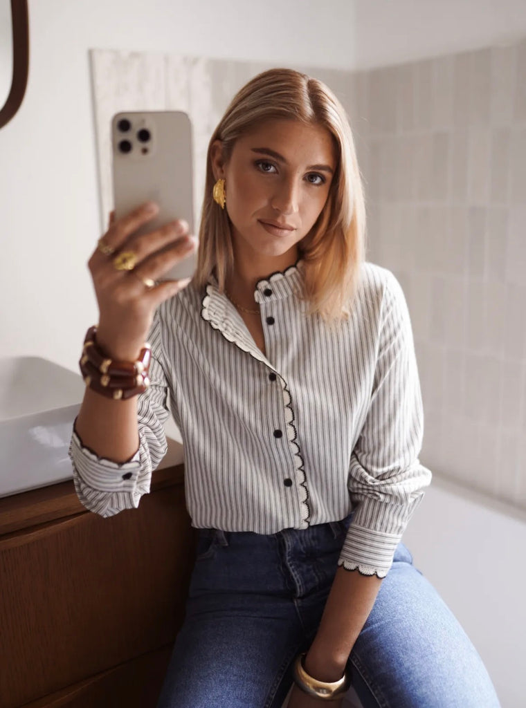 Diese elegante Bluse kombiniert zeitlose Streifen mit femininen Akzenten und wird so zu einem echten Highlight für stilvolle Alltagslooks. Das feine Streifenmuster wirkt klassisch und modern zugleich, während die dekorative Zierkante entlang der Knopfleiste und am Kragen dem Design eine verspielte, edle Note verleiht.
