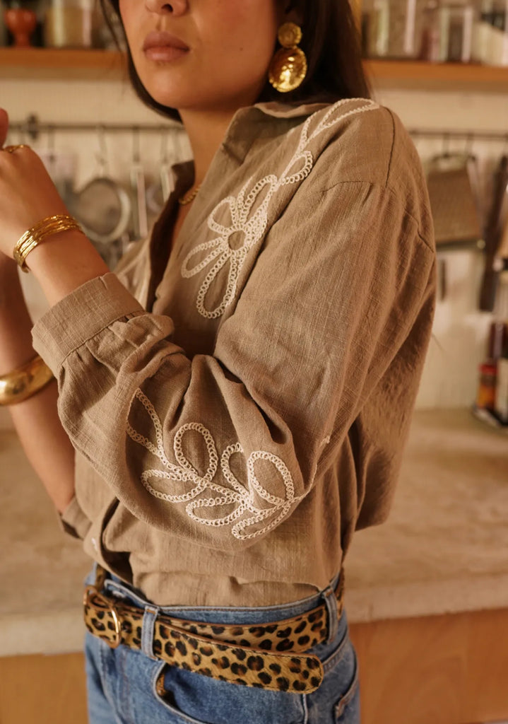 Das Hemd Aubrey verkörpert eine minimalistische, weiche und kontrollierte Ästhetik. In einem warmen, natürlichen Hellbraun gefertigt, besticht es durch seine klaren Linien und sein geradliniges Design. Der Ausschnitt ist zart mit feiner, dezenter Ton-in-Ton-Stickerei verziert, die eine subtile Textur verleiht, ohne die Gesamtharmonie zu stören. Es ist ein Stück, das mit seinen subtilen Details für sich spricht. Der gerade, fließende Schnitt bietet viel Bewegungsfreiheit und ist ideal für eine schlichte, ausgewogene und tragefreundliche Silhouette. Aubrey passt mühelos durch die Jahreszeiten, allein getragen oder unter einem leichten Strick. Was wir lieben: die friedliche Ausstrahlung dieses Hemdes, seine erdfarbene Farbpalette und die dezente Raffinesse der Stickerei – eine Hommage an Handwerkskunst im modernen Stil.
