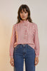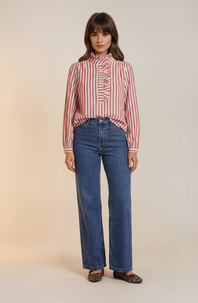 Diese stilvolle Bluse aus 100 % Baumwolle überzeugt mit ihrem klassischen Streifenmuster in warmem Rot-Weiß und liebevollen Details. Der zarte Stehkragen sowie die dekorative Rüschenleiste entlang der Knopfleiste verleihen ihr eine feminine, elegante Note mit einem Hauch Vintage-Charme.