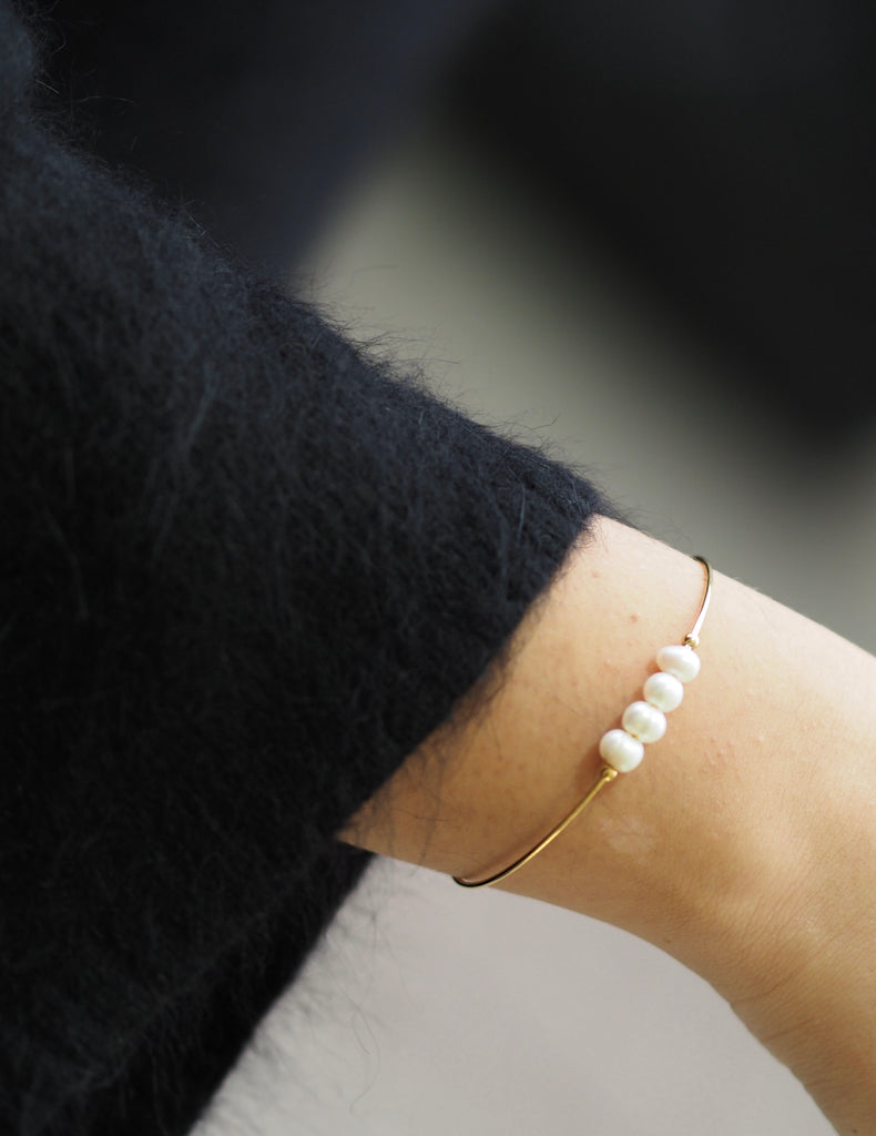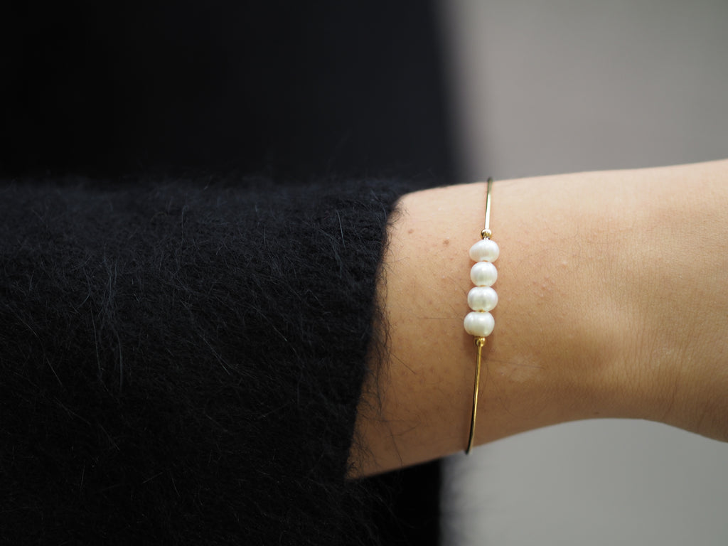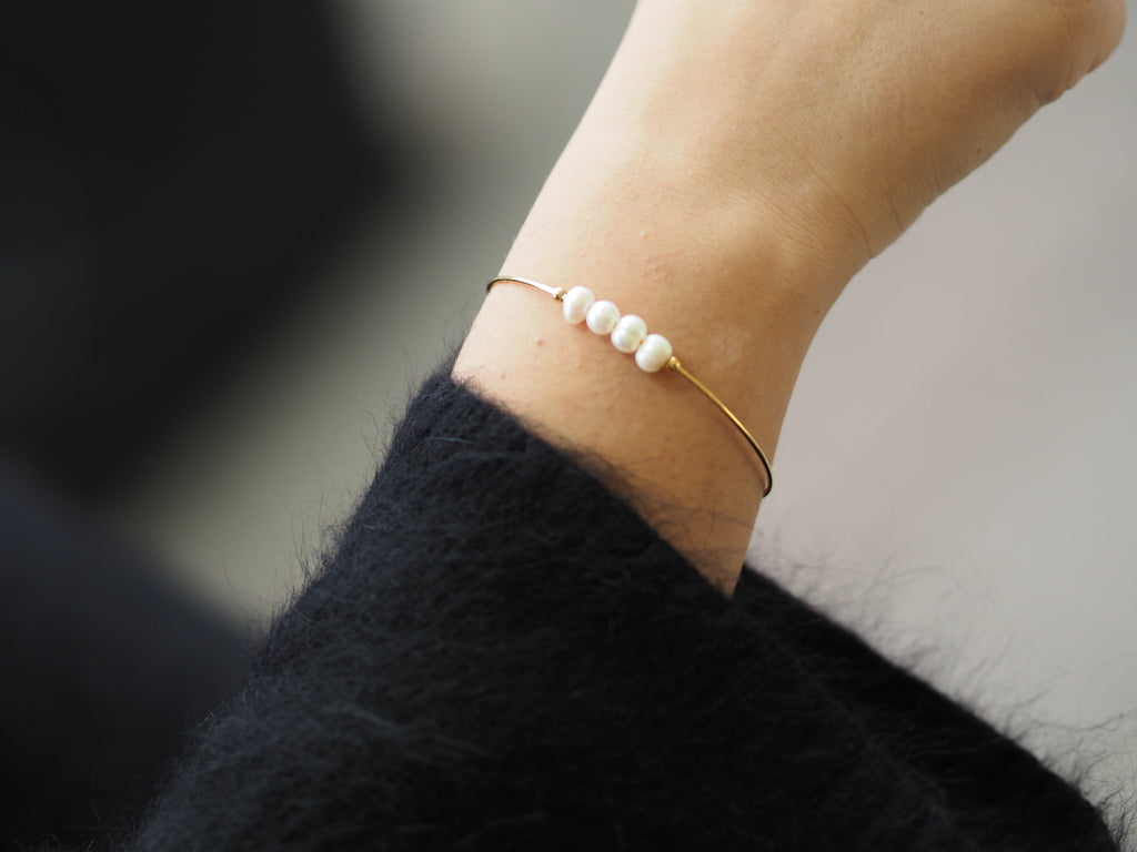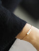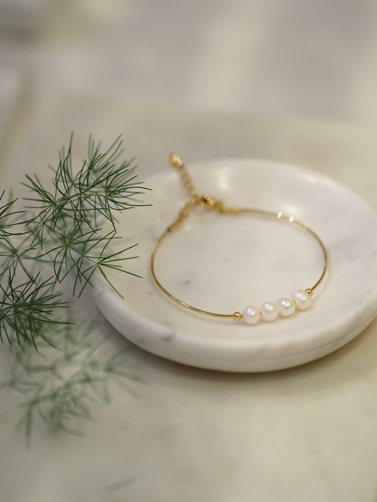 Die Perlen sind geradlinig nebeneinander aufgereiht und bilden den dezenten Mittelpunkt des Schmuckstücks.