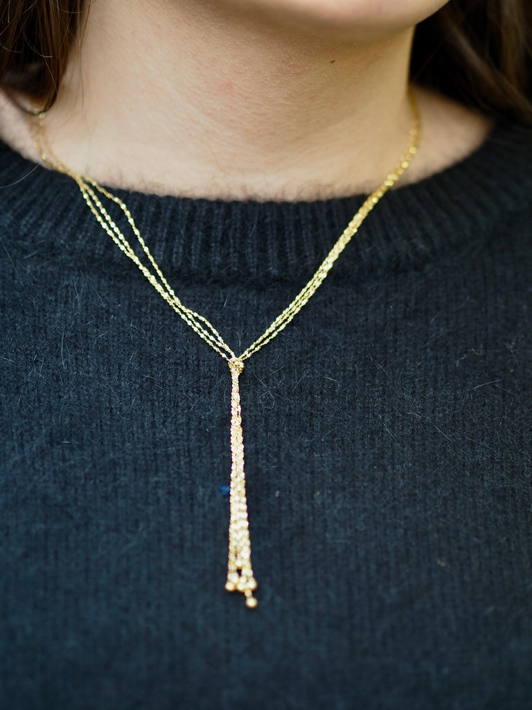 Diese filigrane Halskette vereint schlichte Eleganz mit einem besonderen, feinen Blickfang. Zwei zarte, goldfarbene Ketten laufen in der Mitte zusammen und formen einen wunderschönen Tassel-Anhänger, der aus mehreren feinen Strängen besteht. Kleine goldene Kugeln am unteren Ende des Anhängers setzen zusätzliche Akzente und verleihen der Kette eine edle, feminine Note.