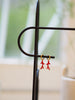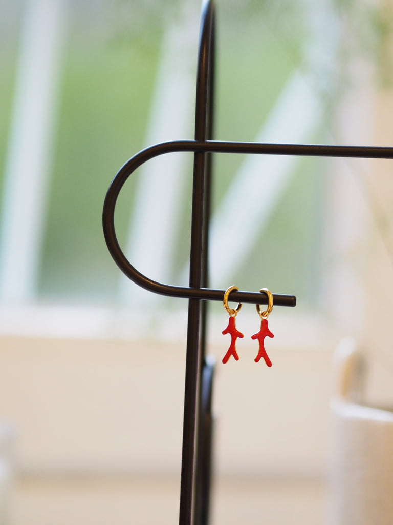 Die Ohrringe bestehen aus kleinen, goldfarbenen Creolen, an denen jeweils ein leuchtend roter Anhänger befestigt ist. Die Anhänger haben eine organische, korallenartige Form, die an kleine, stilisierte Meerzweige erinnert. Durch das kräftige Rot stechen sie sofort ins Auge und verleihen dem Schmuckstück eine frische, mediterrane Note.