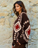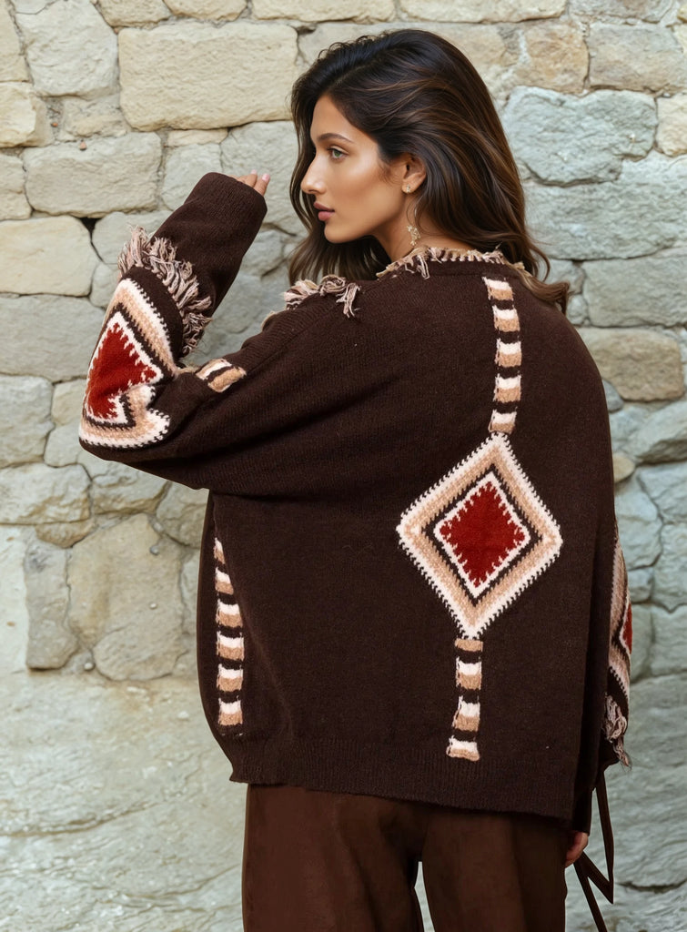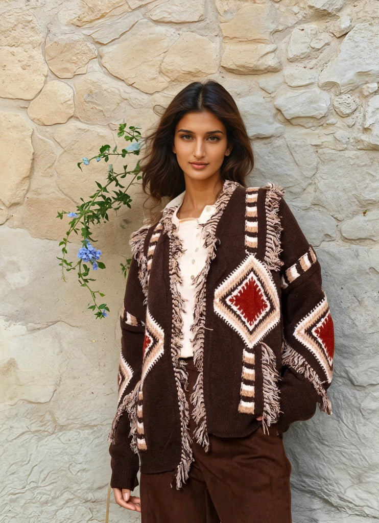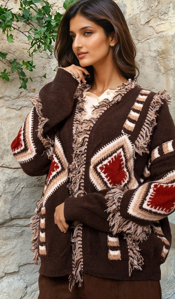 Dieser außergewöhnliche Cardigan vereint lässigen Boho-Charme mit modernem Statement-Design. Das markante Ethno-Muster in warmen Braun-, Creme- und Rottönen macht ihn zu einem echten Hingucker und verleiht jedem Outfit eine besondere Note. Die offenen Kanten mit dekorativen Fransen unterstreichen den entspannten, stilvollen Look.