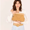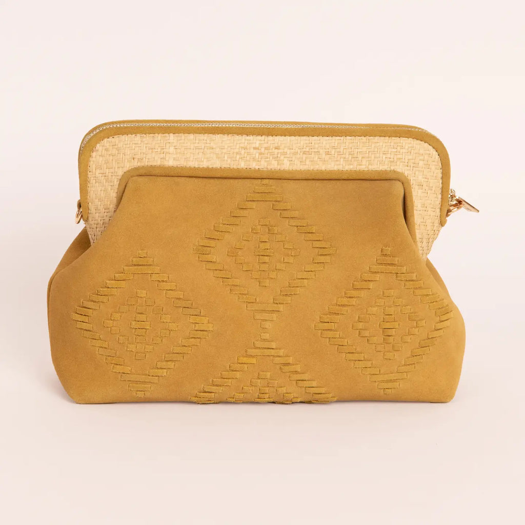 Clutch aus Wildleder-Rindsleder und natürlicher Raffia, vollständig handbestickt. Mit Reißverschluss für praktische Nutzung. Perfekt, um Ihren Sommeroutfits eine elegante Note zu verleihen. Handwerklich gefertigt in Indien.