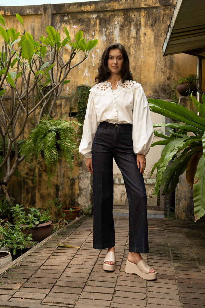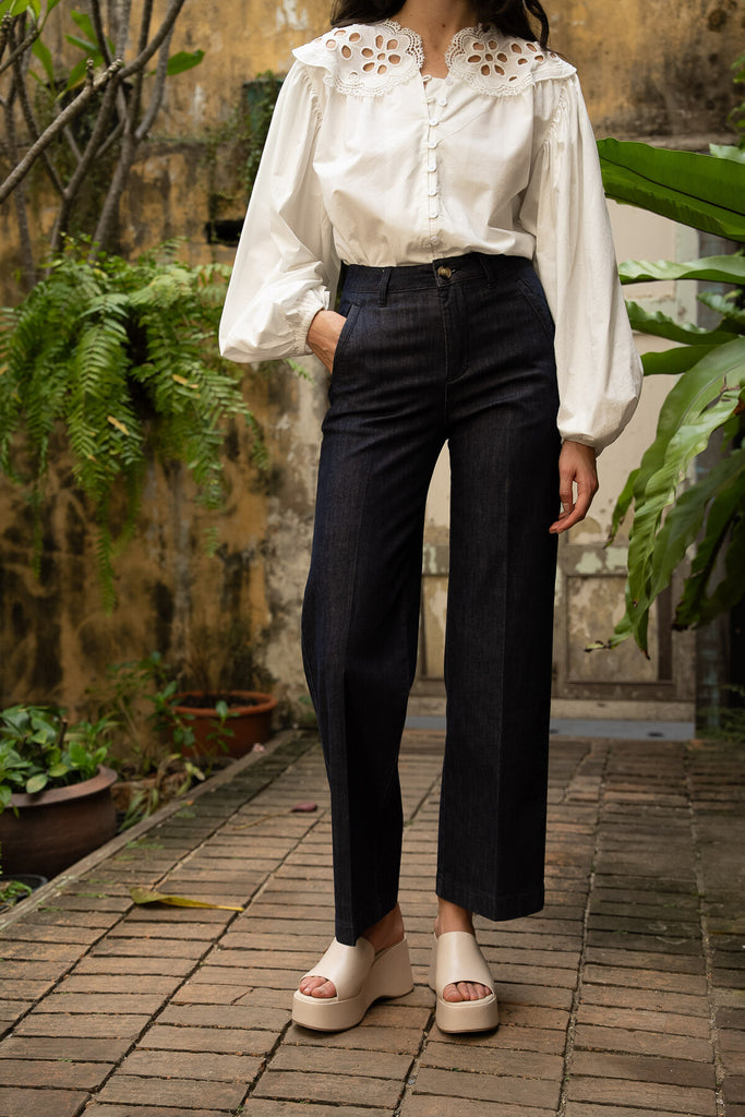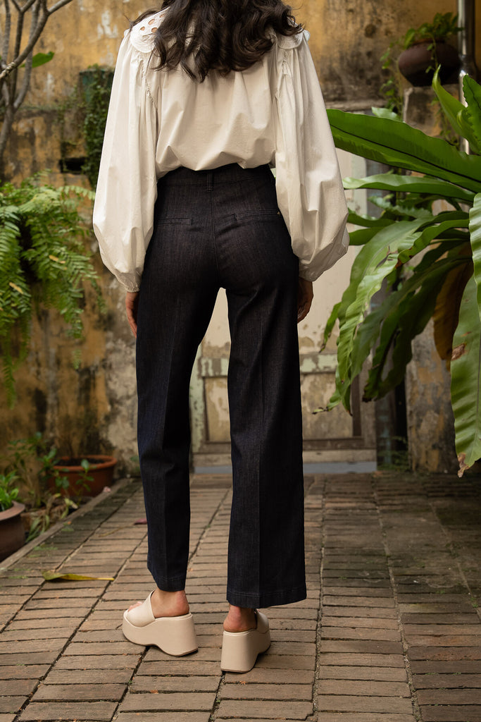 Der reine Baumwoll-Denim sorgt für ein authentisches Tragegefühl und eine natürliche Struktur. Das Material ist angenehm auf der Haut, atmungsaktiv und besonders langlebig – ideal für vielseitige Everyday-Looks. Die dunkle Waschung unterstreicht den edlen Charakter und lässt sich sowohl casual als auch chic kombinieren.