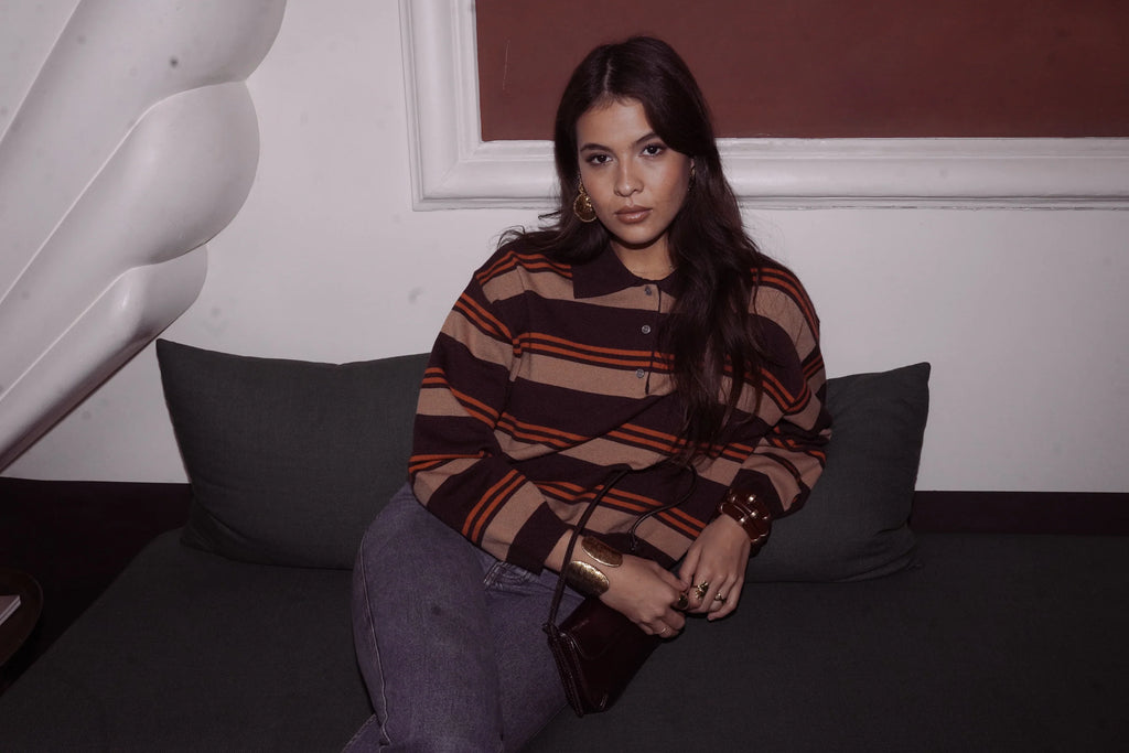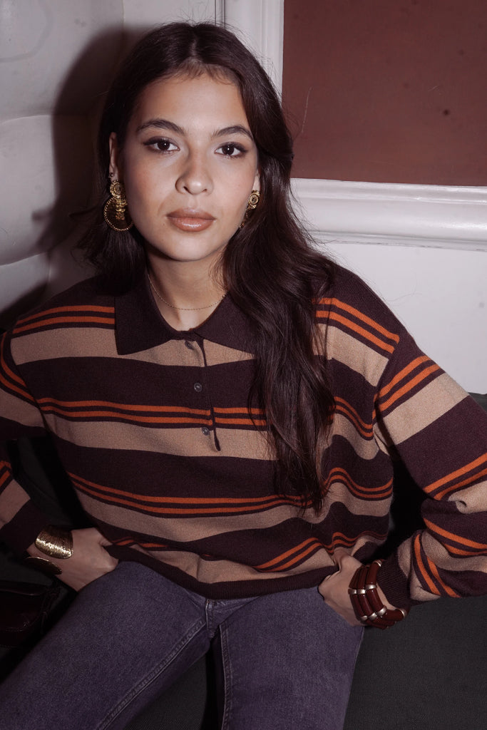 Das Nour Poloshirt versprüht einen warmen Retro-Charme und ist perfekt für ein gemütliches Wochenende. Mit seinen markanten Streifen in Schokoladenbraun, Karamell und Orange-Nuancen setzt es ein modisches Statement und ist gleichzeitig alltagstauglich. Das weiche Strickmaterial sorgt für Komfort und Langlebigkeit, während die leicht lockere Passform den lässigen Look verleiht, den wir lieben – ganz ohne Kompromisse bei der Eleganz. Produktdetails: • Weiches und bequemes Strick-Poloshirt • Streifen in Schokoladenbraun, Karamell und Orange • Polokragen mit Knopfleiste • Lange Ärmel • Gerader, bequemer Schnitt