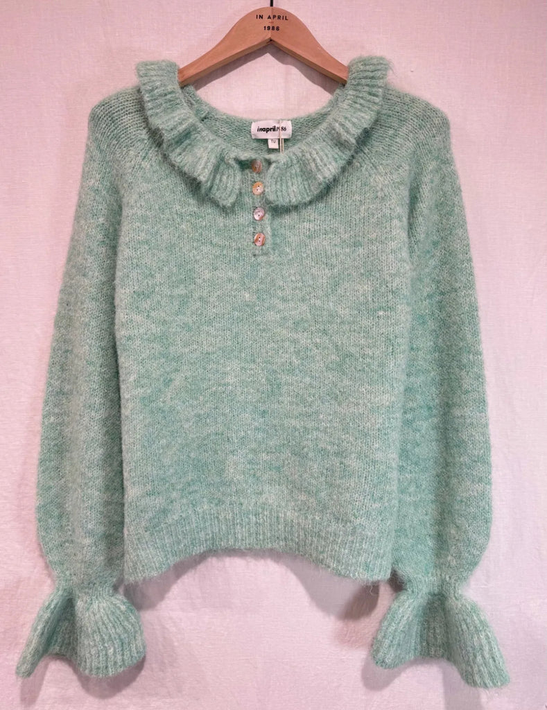 Dieser feminine Pullover besticht durch stilvolle Details und eine elegante Silhouette. Der verspielte Volantkragen verleiht dem Modell eine romantische Note, während die leicht gepufften Ärmel für einen modischen Akzent sorgen und dem Look Volumen und Struktur geben.