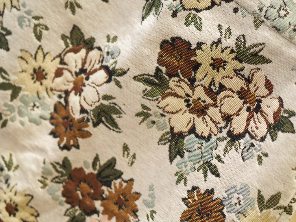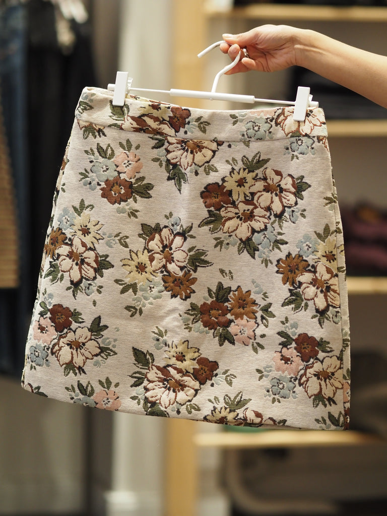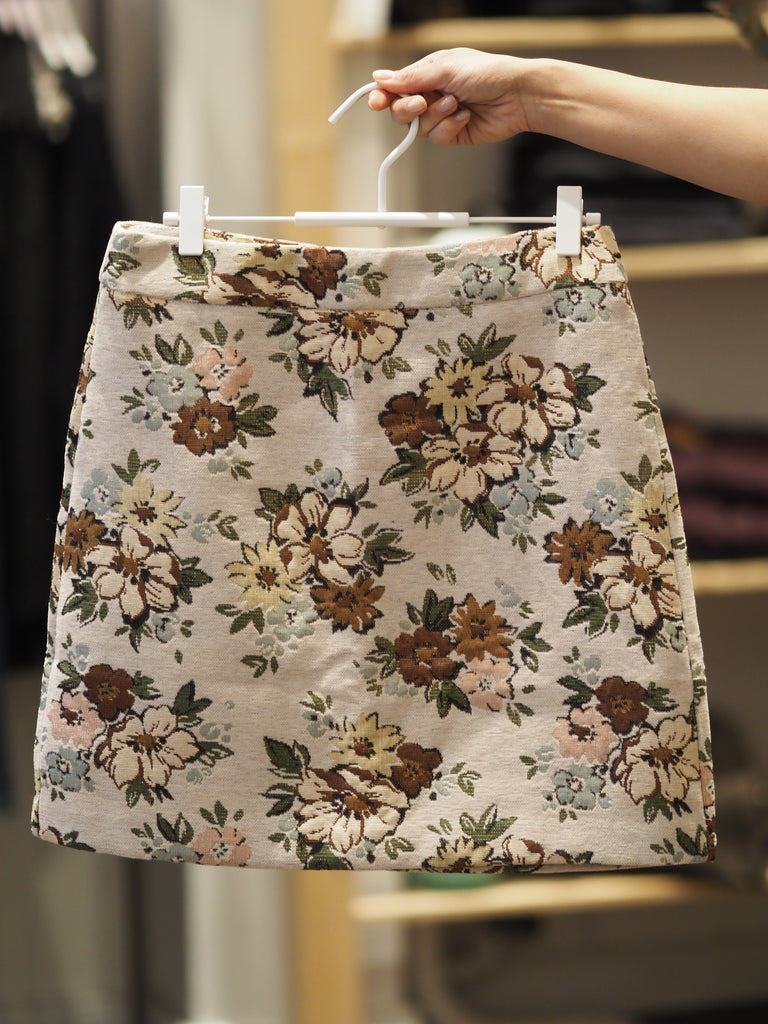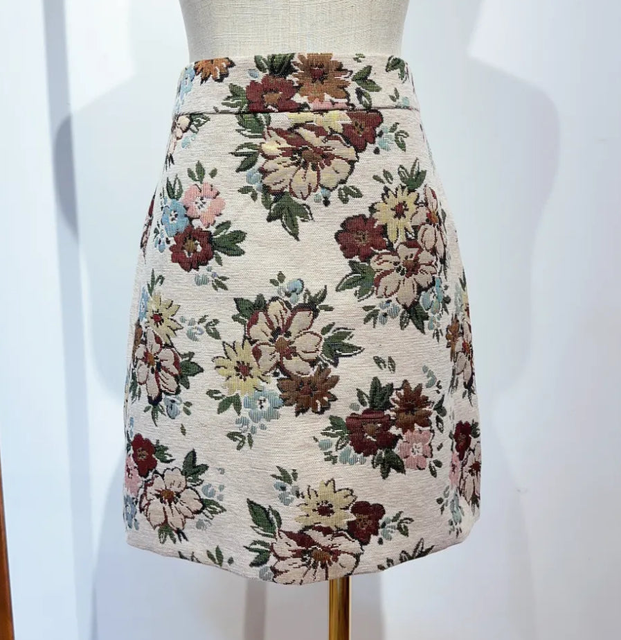 Der Rock ist ein kurzer, leicht A-linienförmiger Minirock aus einem dickeren, strukturierten Stoff, der an Gobelin- oder Jacquardwebung erinnert. Das Muster besteht aus großen, vintage-artigen Blumenmotiven in warmen und leicht gedämpften Farben: