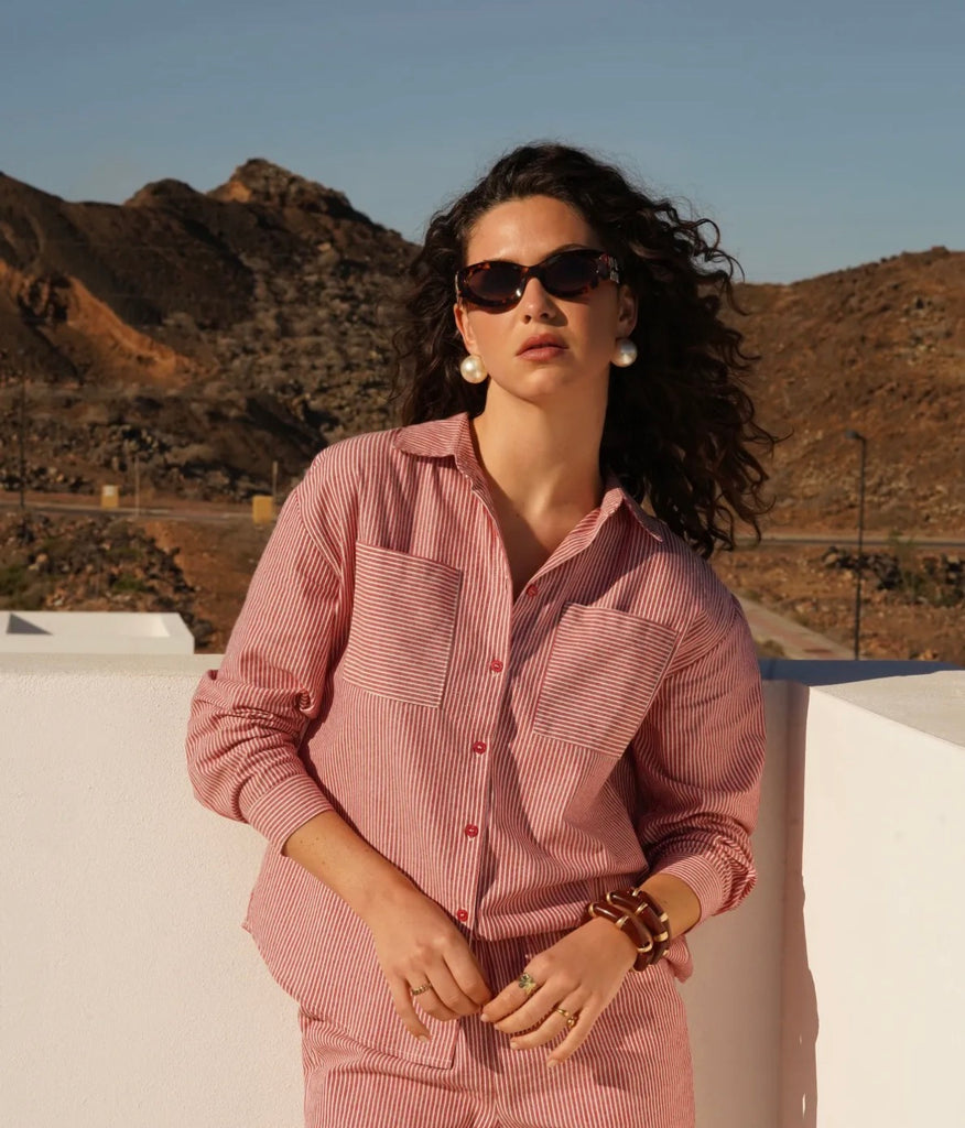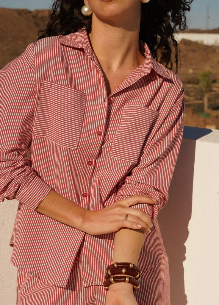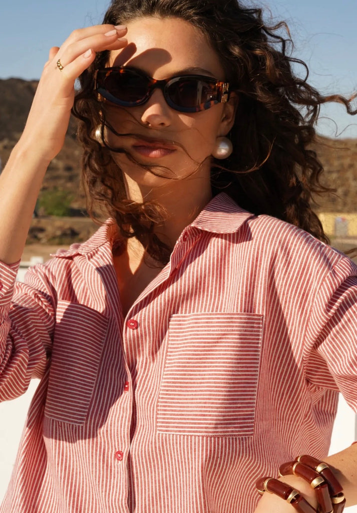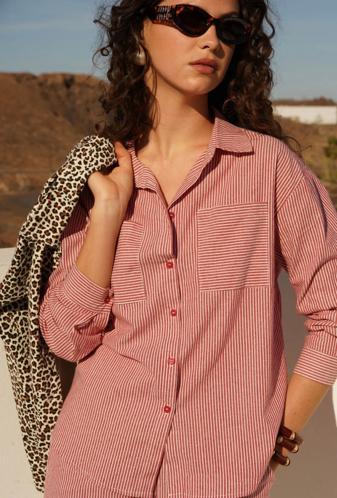 Dieses rot-weiß gestreifte Hemd bringt frische Leichtigkeit und zeitlosen Stil in deine Garderobe. Das klassische Streifenmuster wirkt modern und gleichzeitig elegant – perfekt für entspannte Casual-Looks oder stilvolle Kombinationen im Alltag.