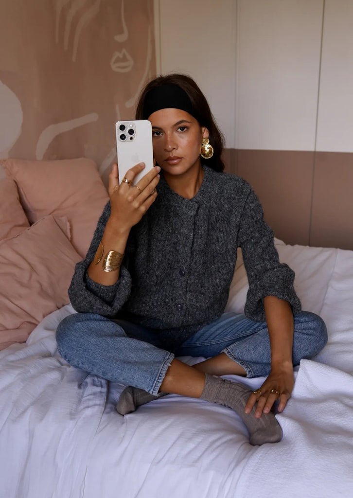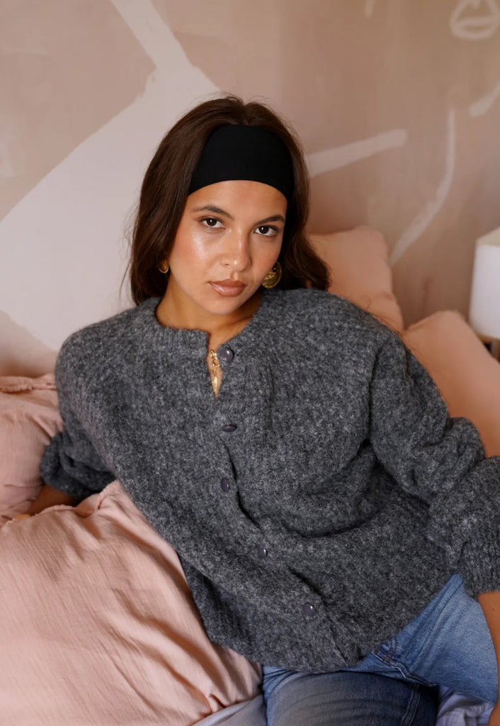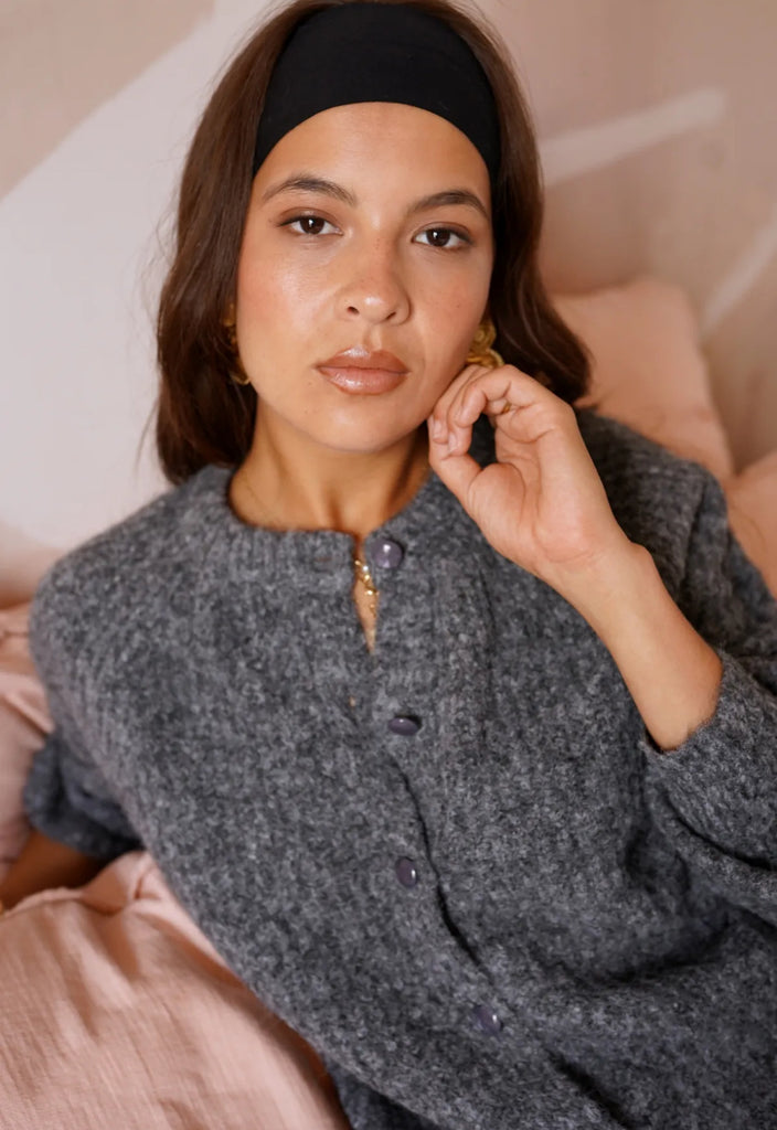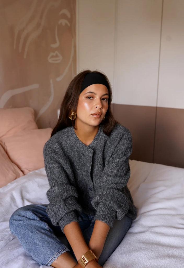 Alméa ist die kuschelige und elegante Strickjacke. Mit ihrem zeitlosen, melierten Grau ist der Alméa-Strick der weiche Begleiter der Saison. Seine weiche Textur und der strukturierte Fall machen ihn bequem und elegant zugleich. Die Ton-in-Ton-Knöpfe verleihen ihm eine raffinierte und dezente Note – ideal für einen lässig-schicken Look. Offen über einem Hemd oder geschlossen als Pullover getragen, passt er sowohl zu lässiger Jeans als auch zu einem fließenden Rock für einen feminineren Look. Ein vielseitiger Strick, perfekt, um den Winter stilvoll zu überstehen. Produktdetails: Melierter Grau-Strickcardigan Gerade und bequeme Passform Elegante Ton-in-Ton-Knöpfe Weiches und flauschiges Finish