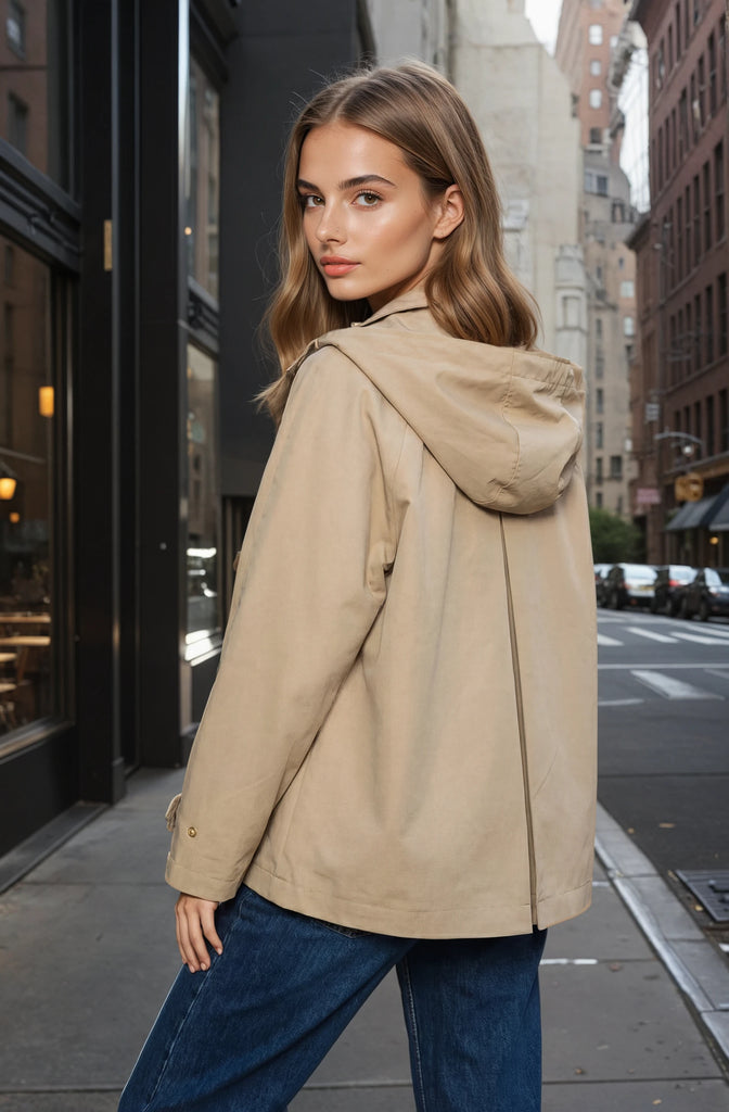 Ein besonderes Highlight ist die abnehmbare Kapuze: Sie verleiht der Jacke einen sportiven Touch und lässt sich je nach Look und Wetter flexibel abnehmen. Mit Kapuze wirkt sie entspannt und urban, ohne Kapuze elegant und clean.