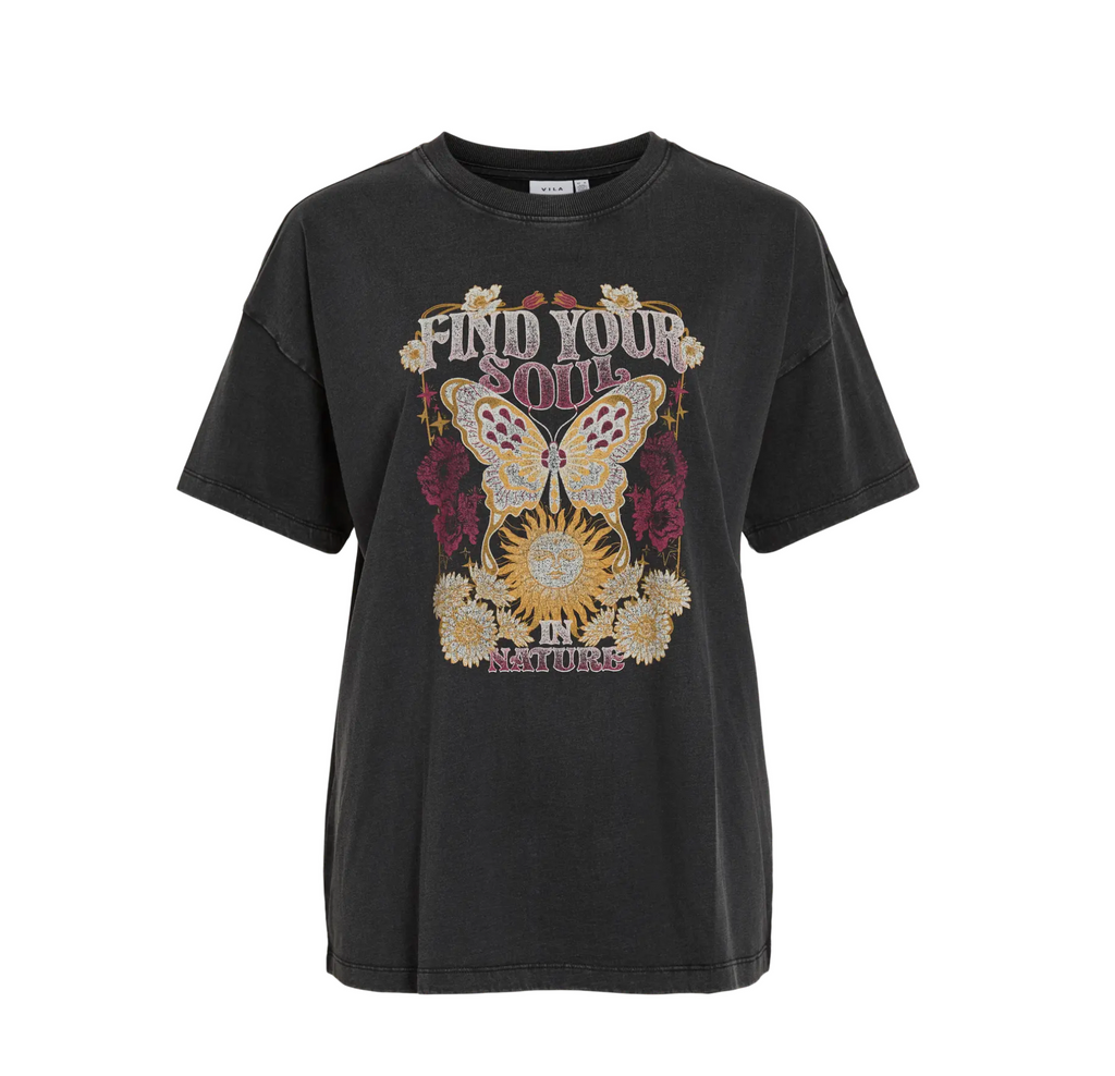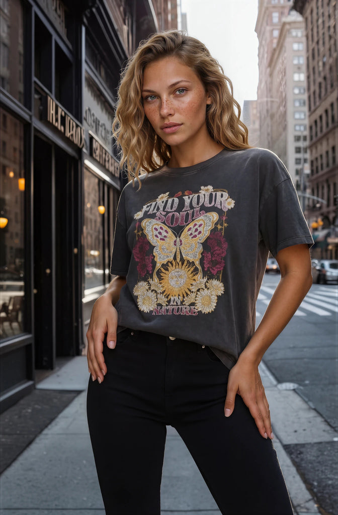 Dieses T-Shirt aus hochwertiger Bio-Baumwolle vereint lässigen Komfort mit ausdrucksstarkem Design. Der dunkle Vintage-Ton bildet die perfekte Bühne für den kunstvollen Frontprint mit Schmetterling, floralen Elementen und Sonne sowie dem inspirierenden Schriftzug „Find Your Soul in Nature“.