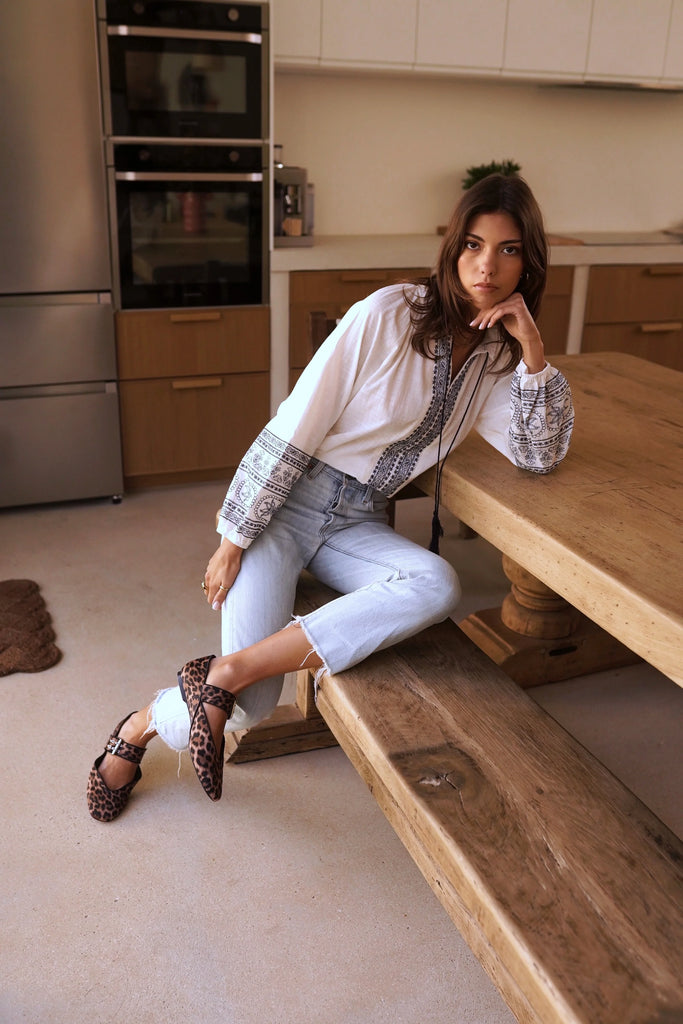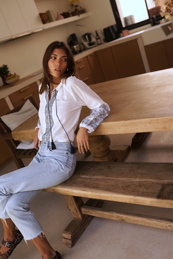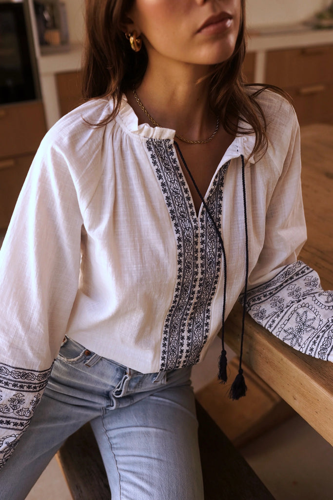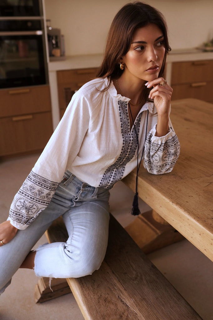 Weiße Bohème-Bluse mit blauer Stickerei an Kragen, Ärmeln und Brust. Fließender Schnitt, lange, leicht gepuffte Ärmel und eine Quastenschleife für einen raffinierten Touch.